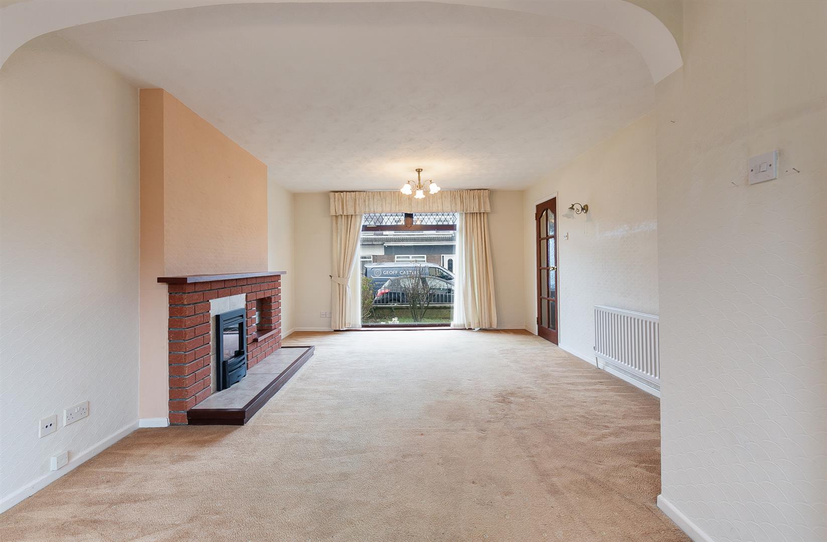 Brick, focal point fireplace with tiled hearth. Picture window to front elevation. Open arch leading to: