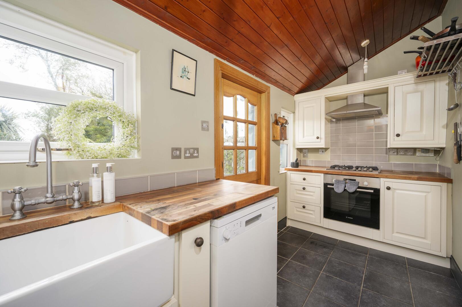 Fitted kitchen with range of high and low level units, wood block worktop, ceramic under mounted sink, chrome mixer tap, plumbed for dishwasher, built-in plate rack and shelf above, integrated under oven, gas hob and stainless steel extractor fan, tongue and groove sloped ceiling, part tiled walls, tiled floor, wooden glazed back door to rear garden, integrated fridge freezer.