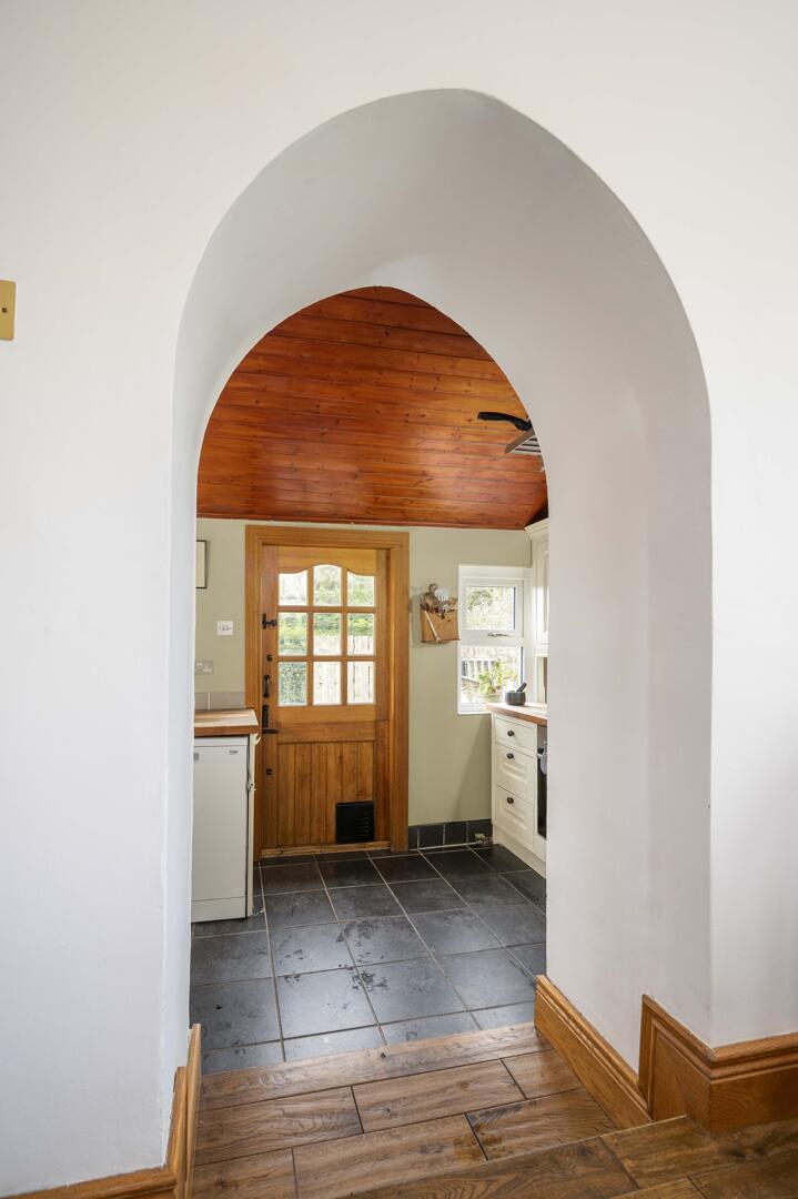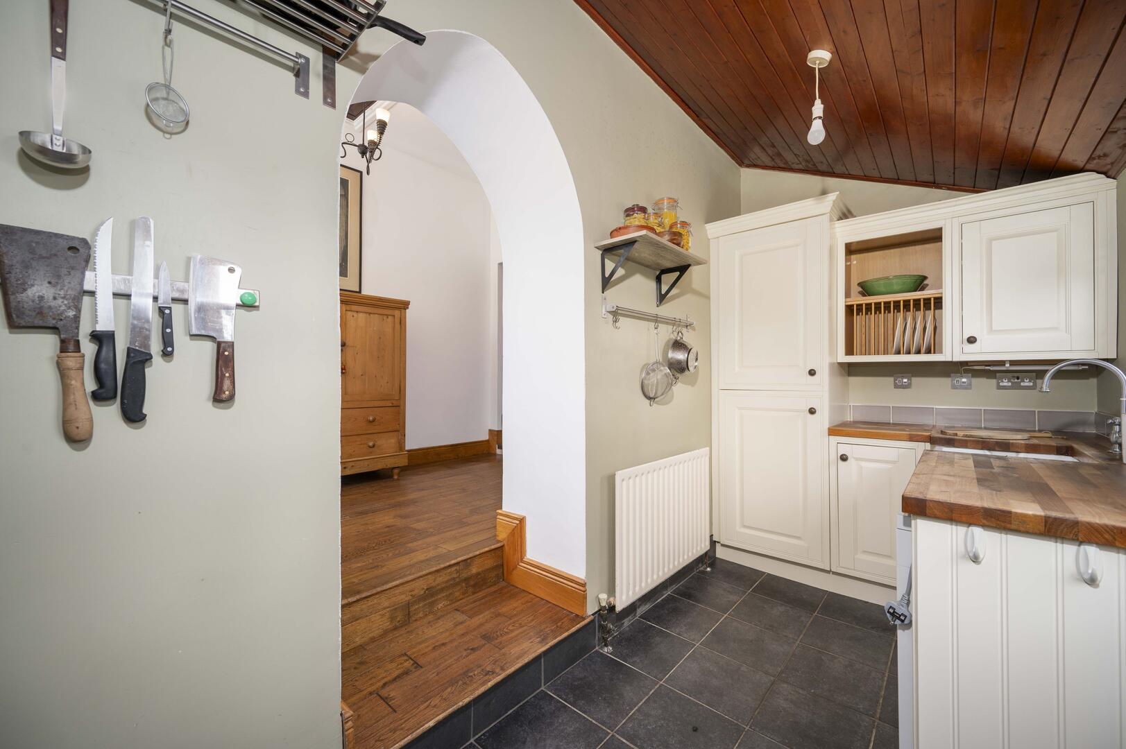 An arched opening leads to a well-appointed fitted kitchen, finished with painted units, wooden worktops, a Belfast sink and tiled flooring. A stable-style rear door provides access to the courtyard.