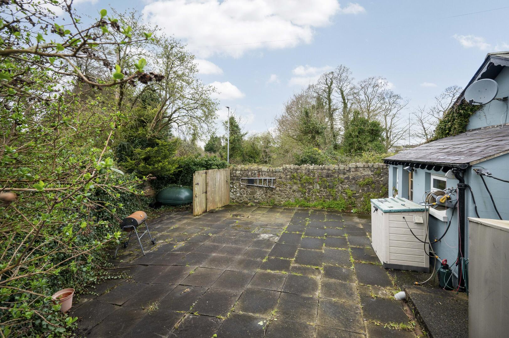 Pillared entrance onto private laneway, stoned garden to side with shed, low maintenance paved garden to rear with sheds, boiler and oil tank, outside light, outside tap.