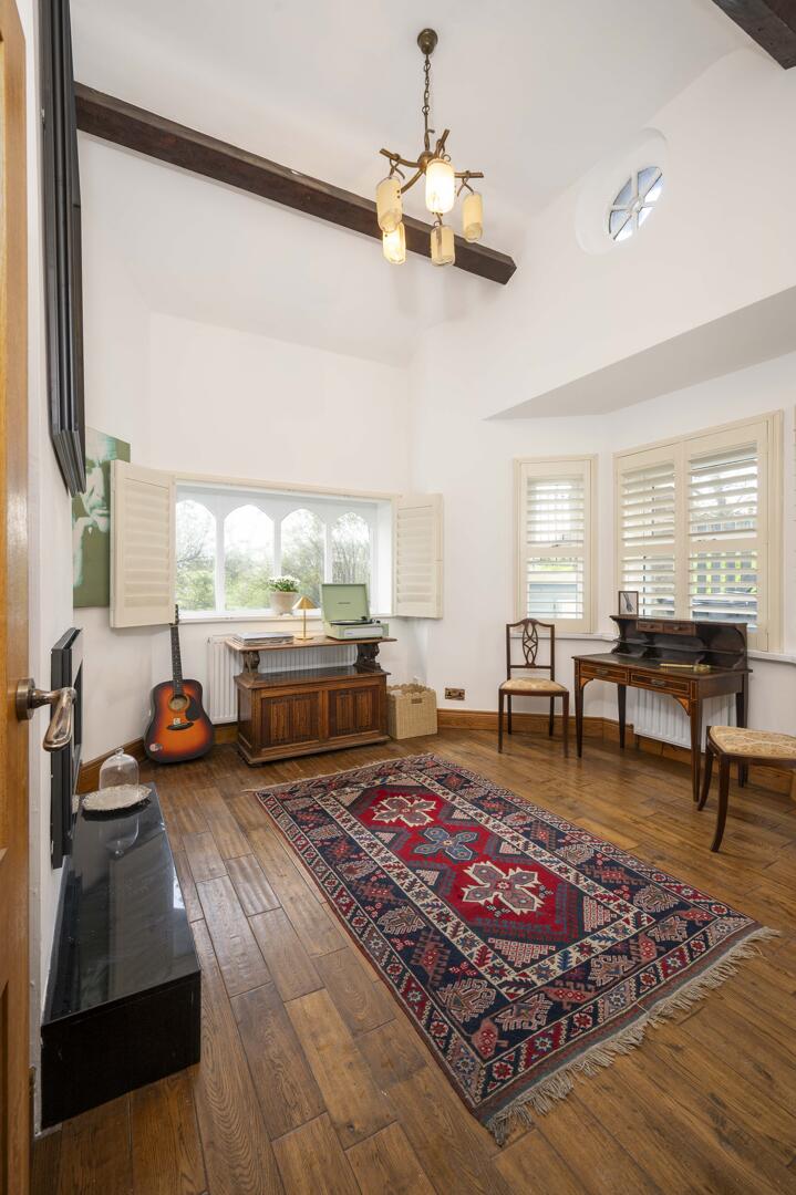 Measurements into bay window, New England style shutters, feature gas fire, solid wood flooring, in-shelving, feature exposed beamed ceiling and porthole style window.