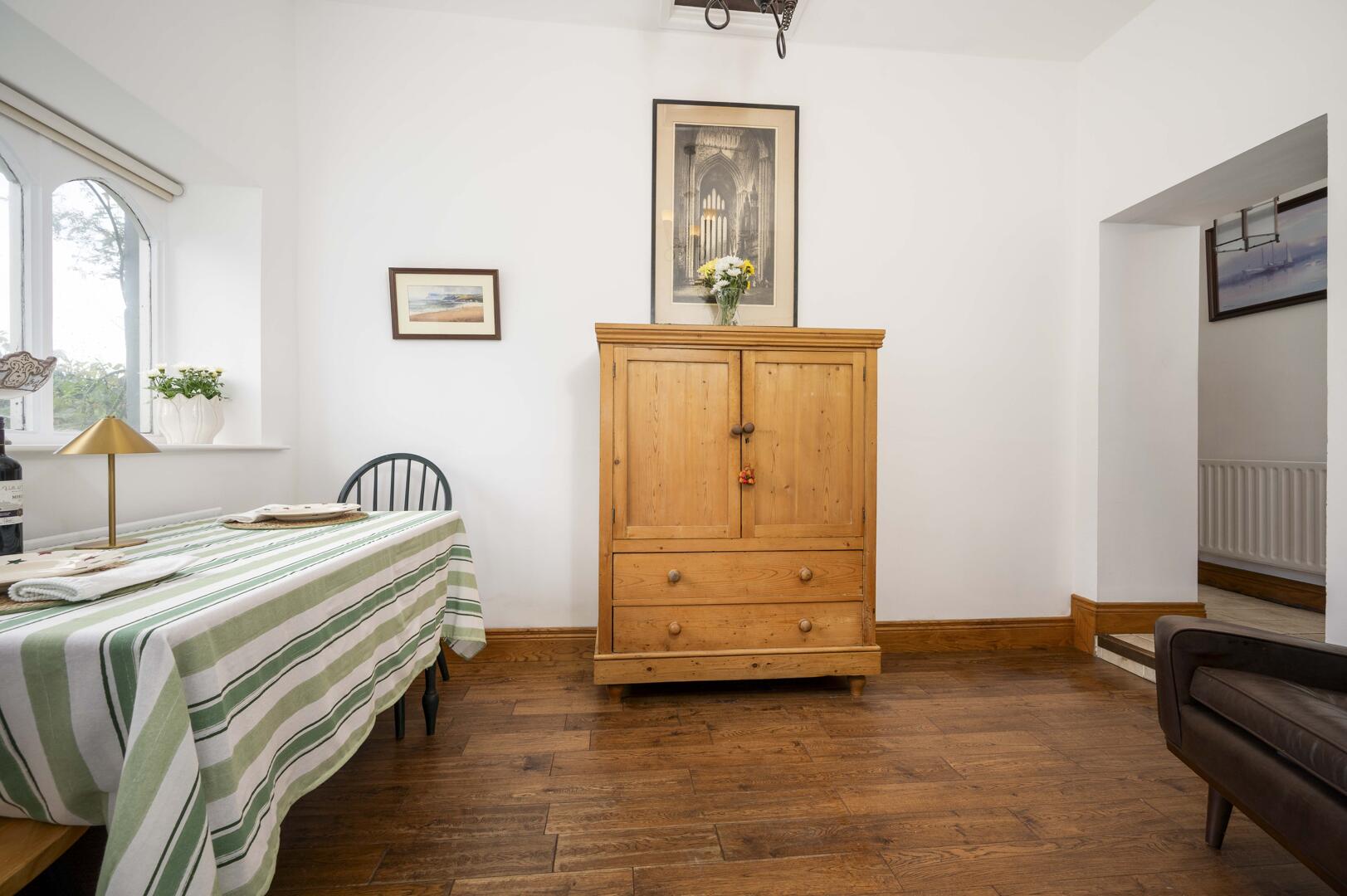 Internally, the accommodation is beautifully presented and full of charm. An inviting entrance hall with tiled flooring and solid wood doors leads to the main living space. The lounge/dining room features exposed beams, solid wood flooring, a feature fireplace and dual-aspect windows with plantation shutters, creating a bright and welcoming atmosphere. There is ample space for both seating and dining.