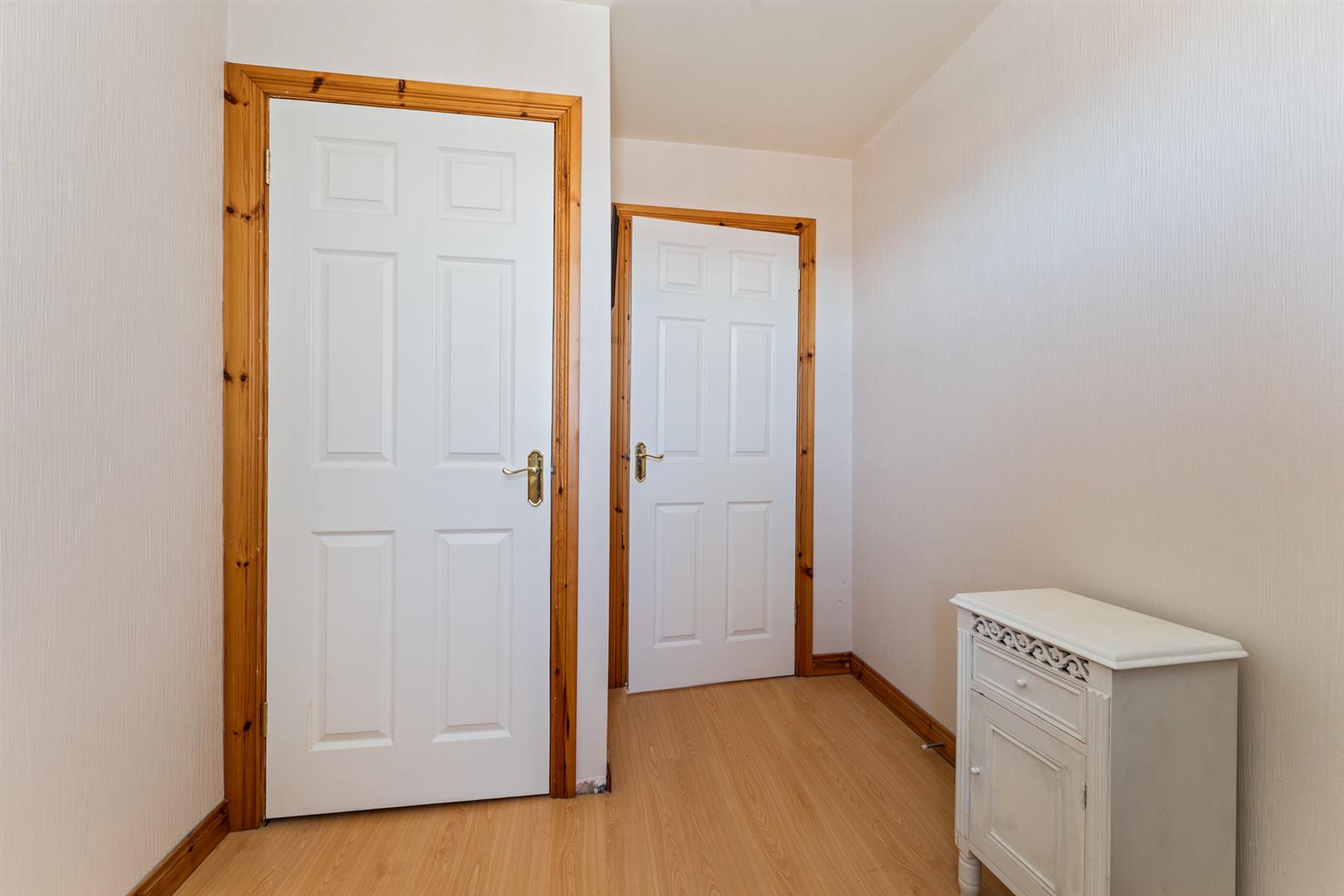 Wood laminate flooring, built in storage.