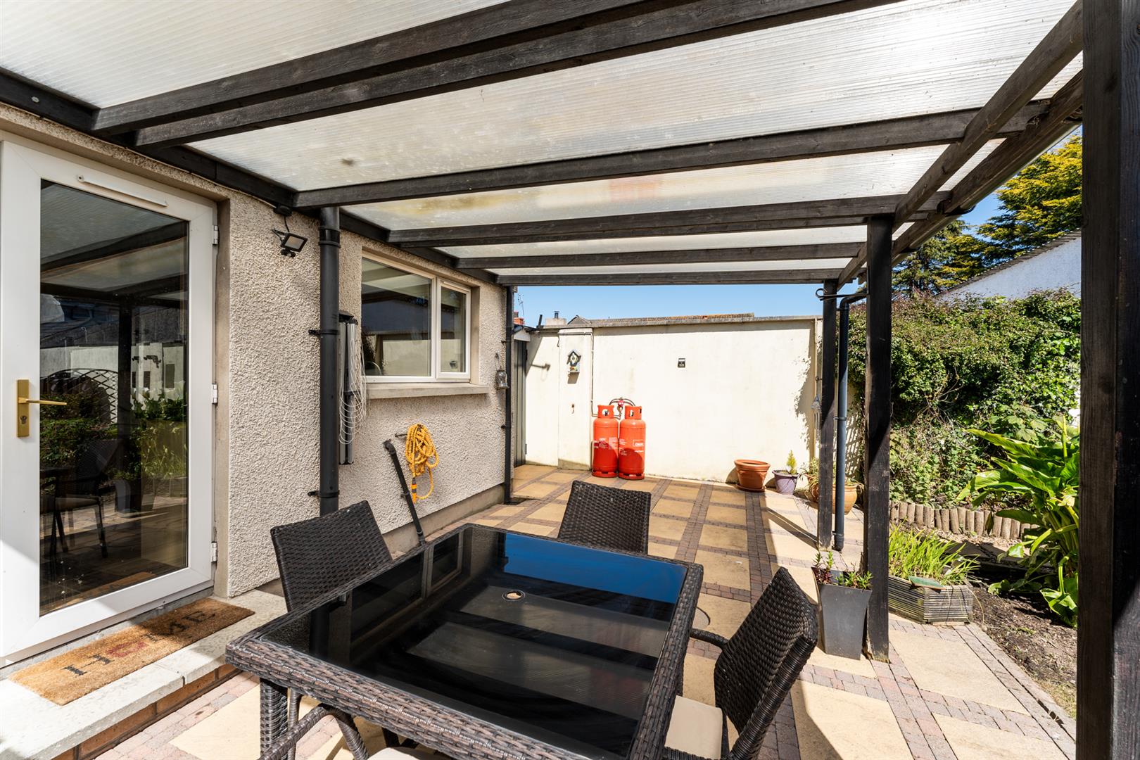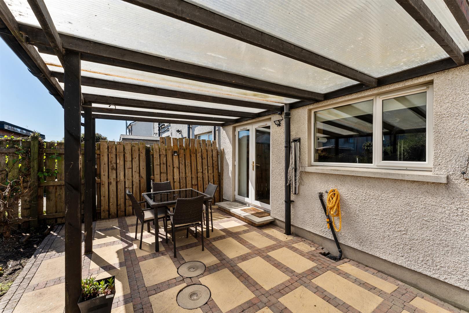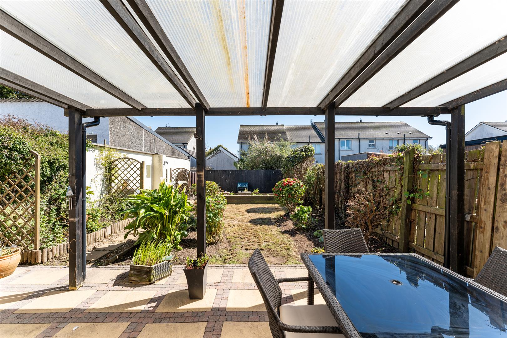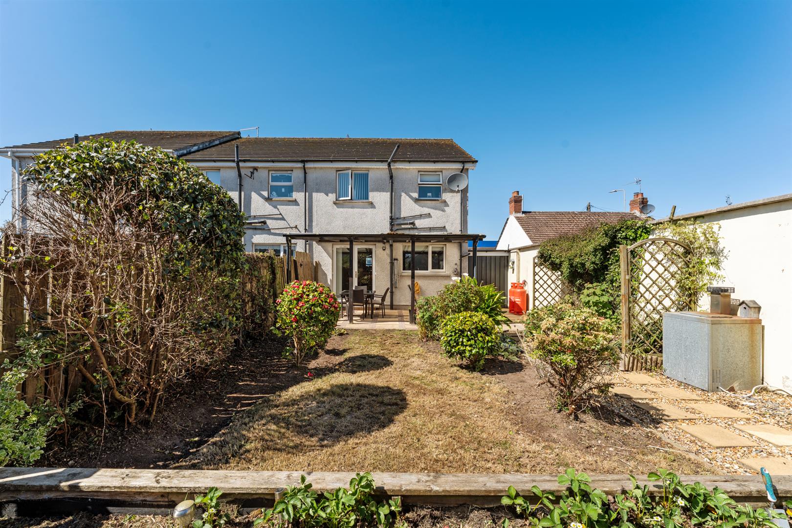 Rear: Enclosed South-East facing rear garden with covered patio leading to lawn with flowerbeds.