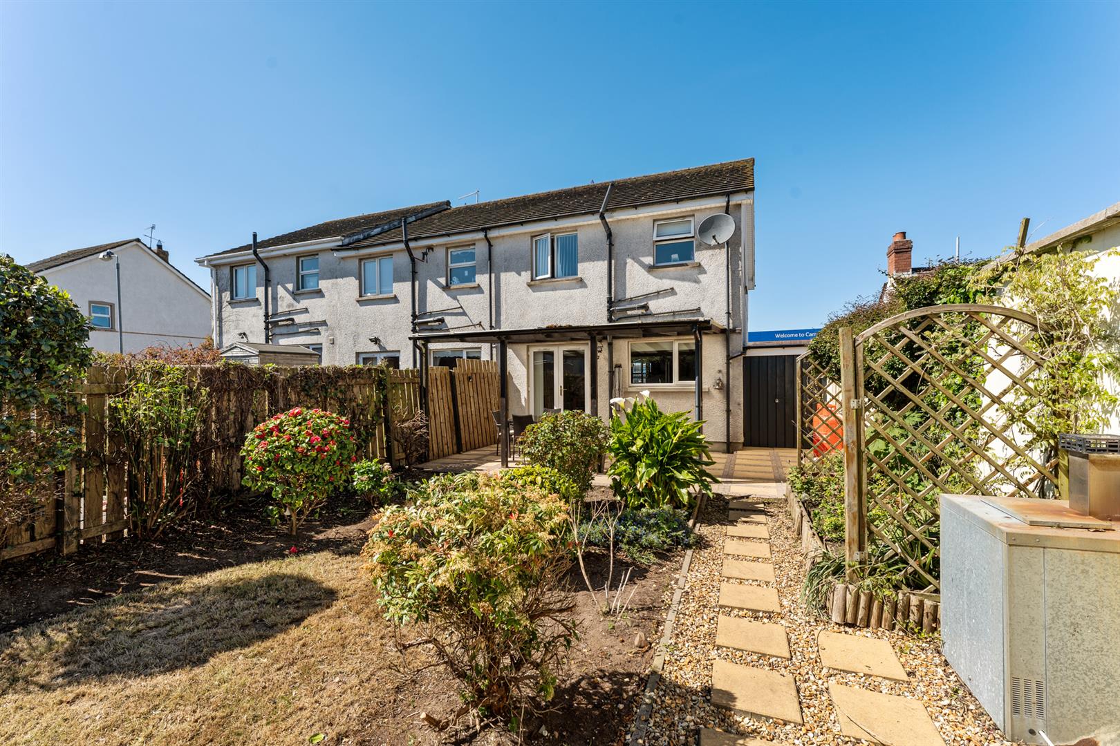 Front: Fully enclosed, small front garden with paved area.