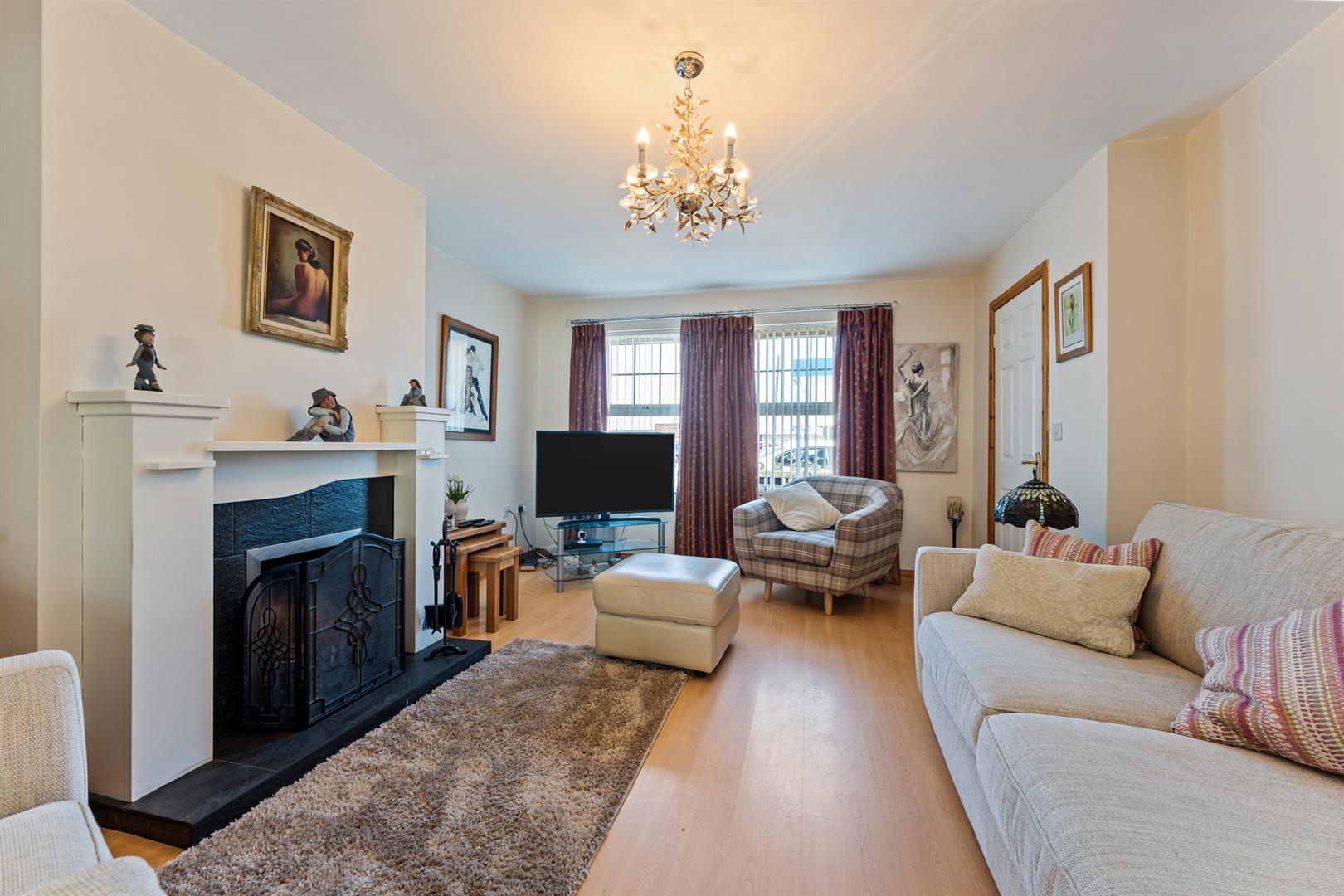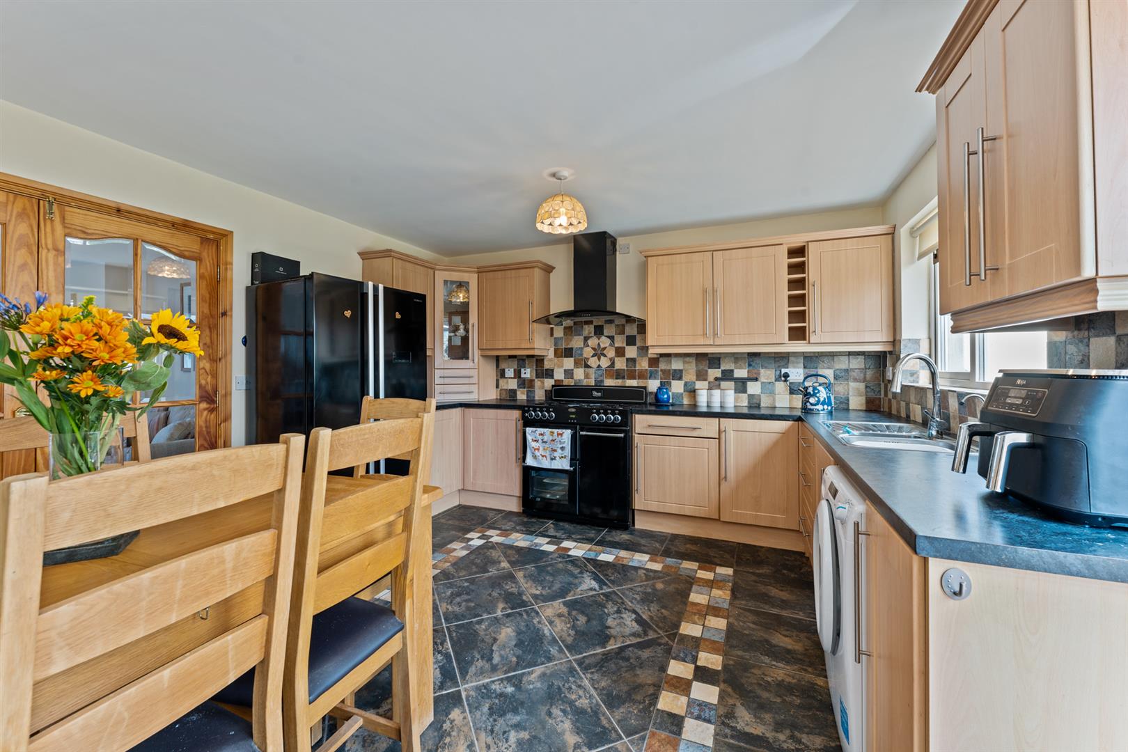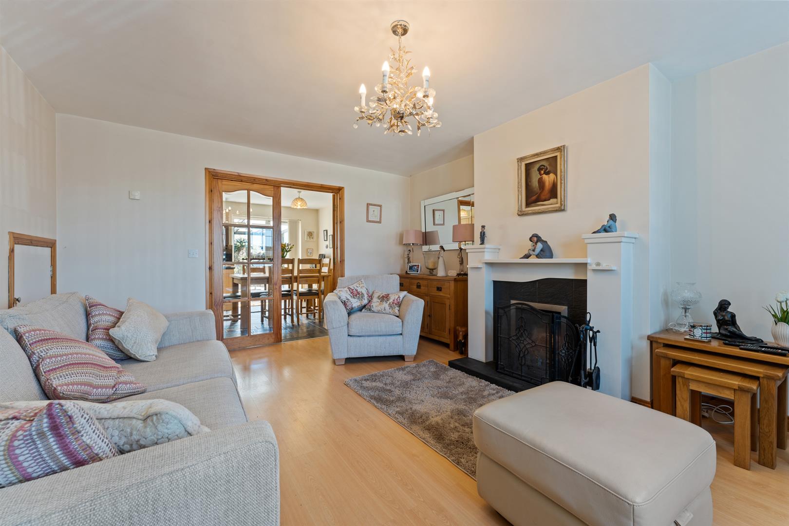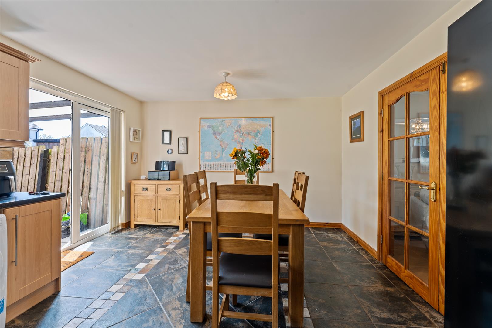 39 Main Street presents a well-maintained and practical home offering comfortable living in a convenient location. Internally, the property is accessed via an entrance hall with tiled flooring, leading through to a bright and welcoming living room featuring an attractive open fireplace and useful under-stairs storage. Double doors open into a spacious kitchen and dining area, fitted with a range of units and ample space for everyday appliances, with patio doors providing direct access to the rear garden ideal for both day-to-day living and entertaining.