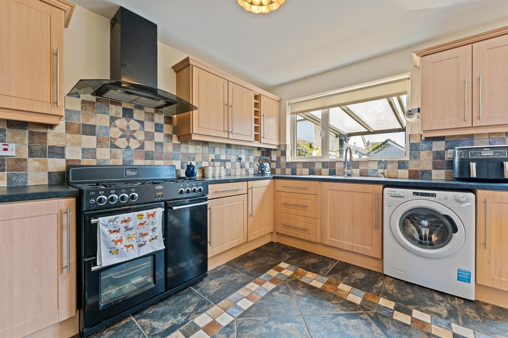 Range of high and low level units with granite effect work surfaces, inset one and a quarter bowl stainless steel sink unit with mixer taps, space for gas range cooker, extractor hood, space for fridge freezer, plumbed for washing machine, partly tiled walls and ceramic tiled floor. Open plan to dining area with patio doors to rear garden.