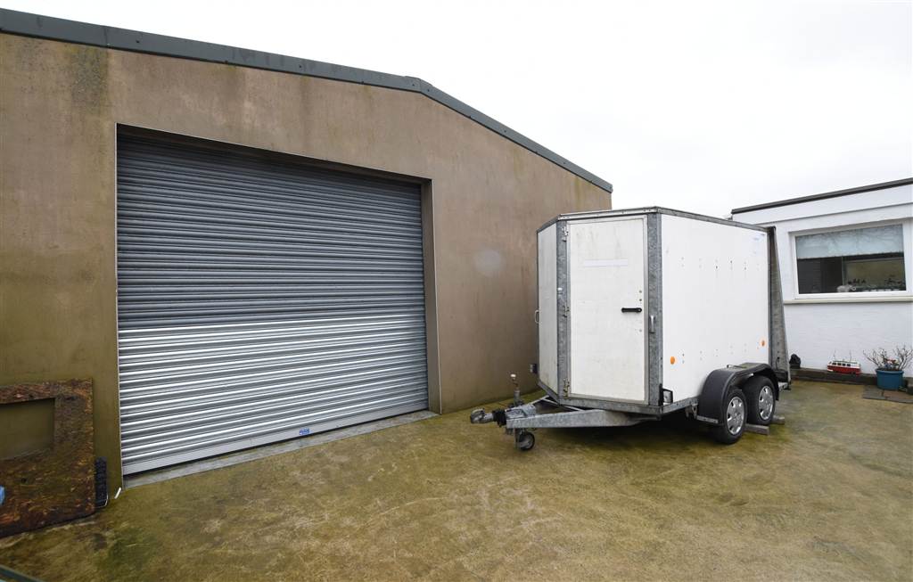 Large modern garage/ workshop with electric roller shutter door leading to concrete driveway.