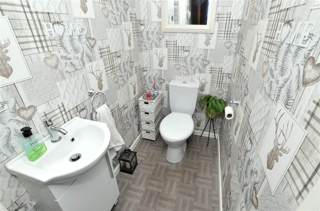 W.c located in the entrance hall with wc and wash hand basin on a storage cupboard.