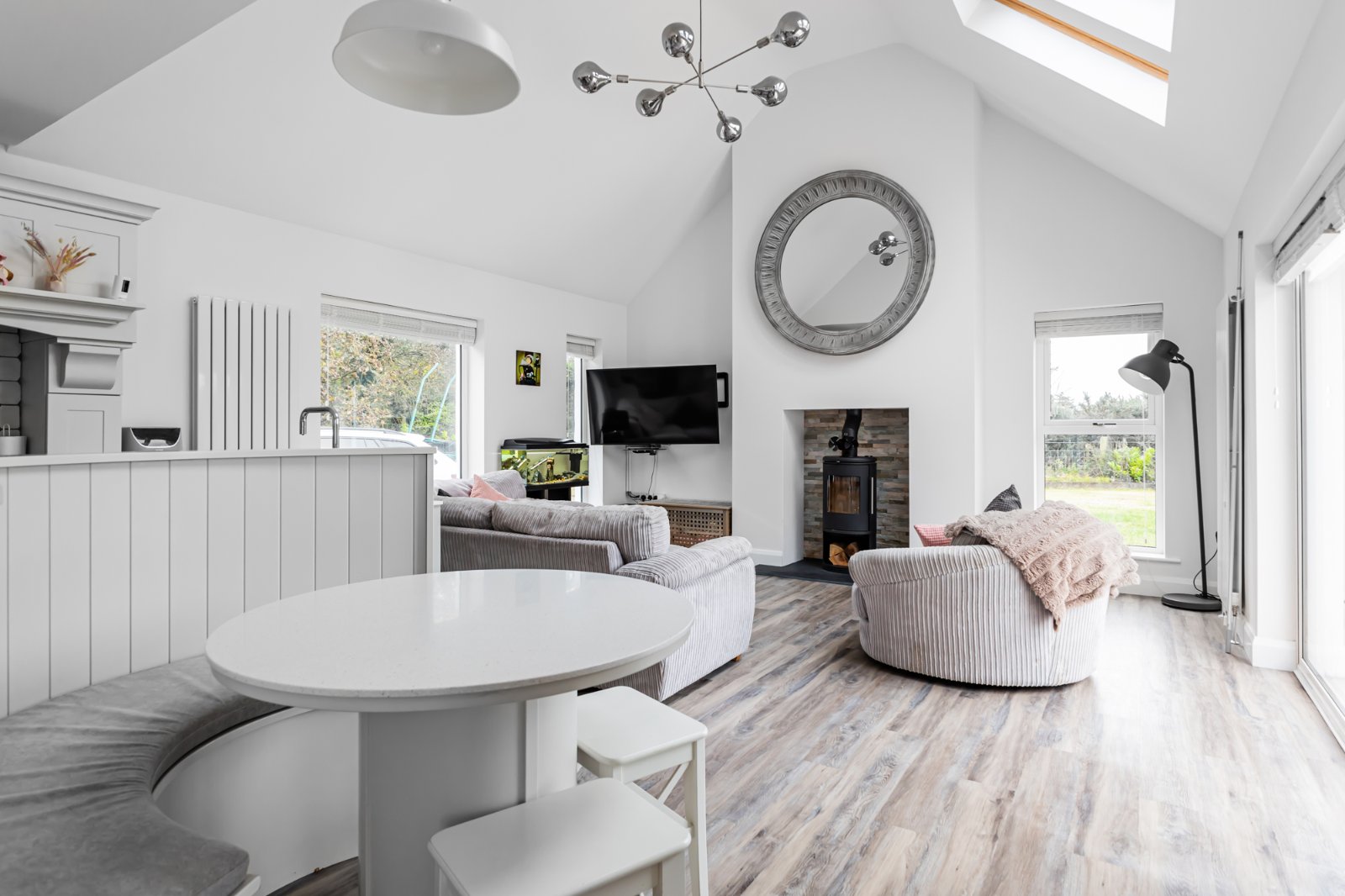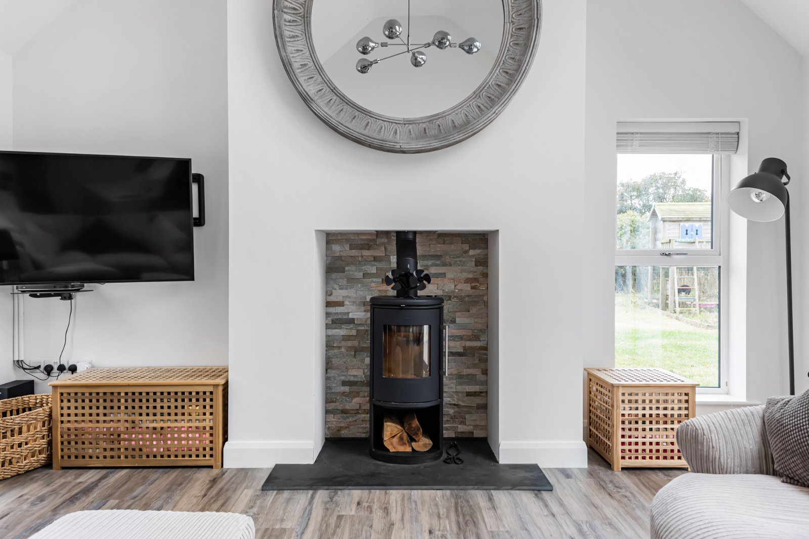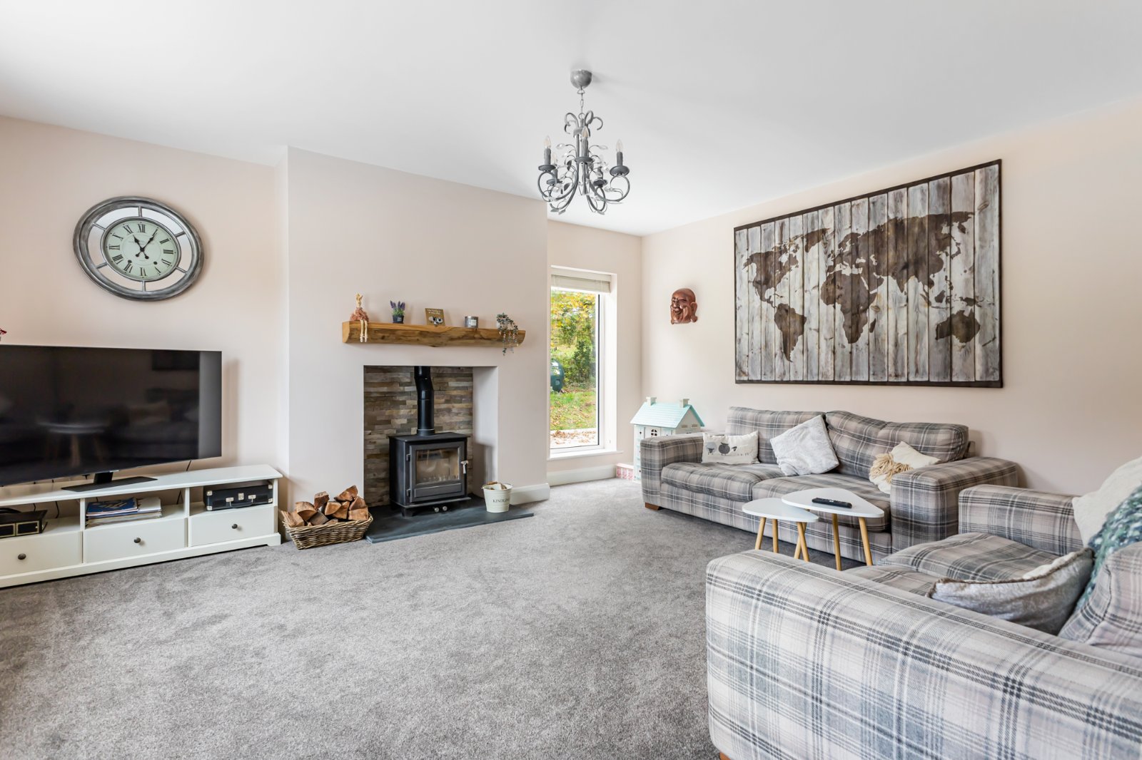 A bright and welcoming living room, also with a feature stove, offers a cosy retreat - ideal for relaxing evenings.
