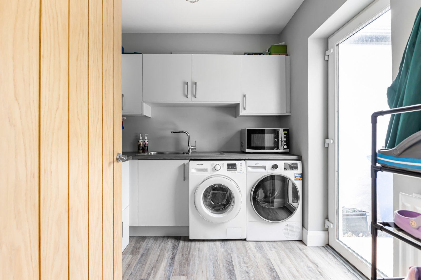 Range of high and low units with laminate worktops. Plumbed for washing machine and space for tumble dryer. Stainless steel single drainer sink unit with flexible pull out mixer tap. Hot press. Karndean flooring and PVC glazed door to side.