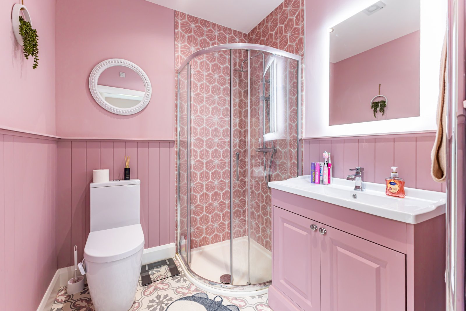 Contemporary three-piece white suite comprising low flush WC, vanity wash hand basin with mixer tap and enclosed shower cubicle with thermostatically controlled shower. Tiled floor with partially tiled walls. Feature wood panelling. Chrome towel rail, recess spotlights and extractor fan.