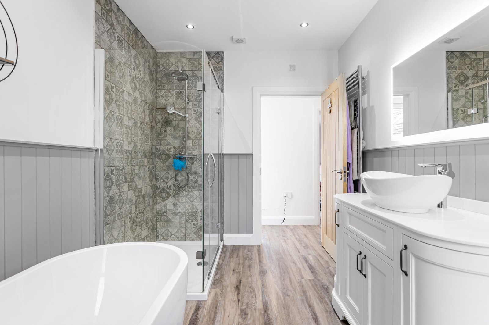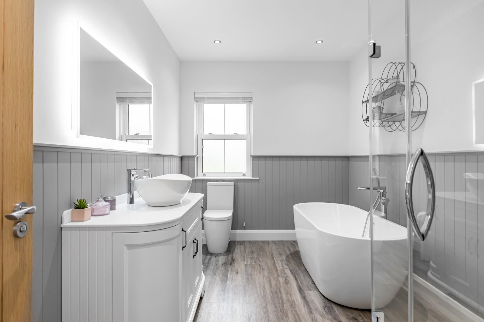 Luxurious four-piece white suite including low flush WC, large vanity wash hand basin with mixer tap, freestanding contemporary bath with mixer tap and enclosed shower cubicle with thermostatically controlled shower. Karndean flooring with partially tiled walls and wood wall panelling. Recess spotlights and extractor fan.