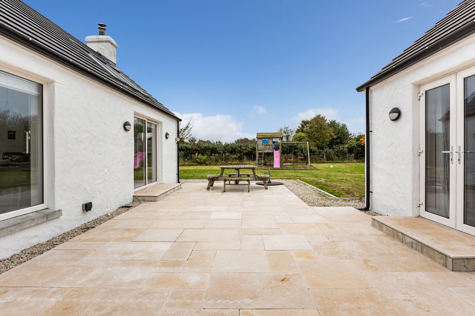The exterior of this charming home is equally impressive. To the rear, a large courtyard-style patio area provides a private and sheltered outdoor space, ideal for dining al fresco, entertaining, or simply enjoying the sun. The property is surrounded by beautifully maintained gardens, with lawn areas and mature planting adding to its cottage-style appeal.