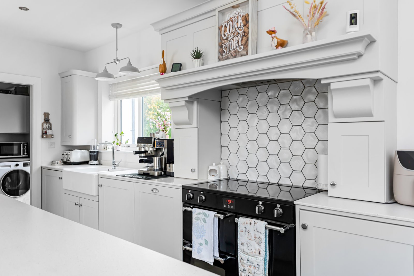 At the heart of the home lies a large open-plan kitchen, dining, and living area, featuring stunning bespoke kitchen units and high-quality finishes. This space is flooded with natural light and includes a stove to the living area, creating a perfect setting for both everyday family moments and entertaining.