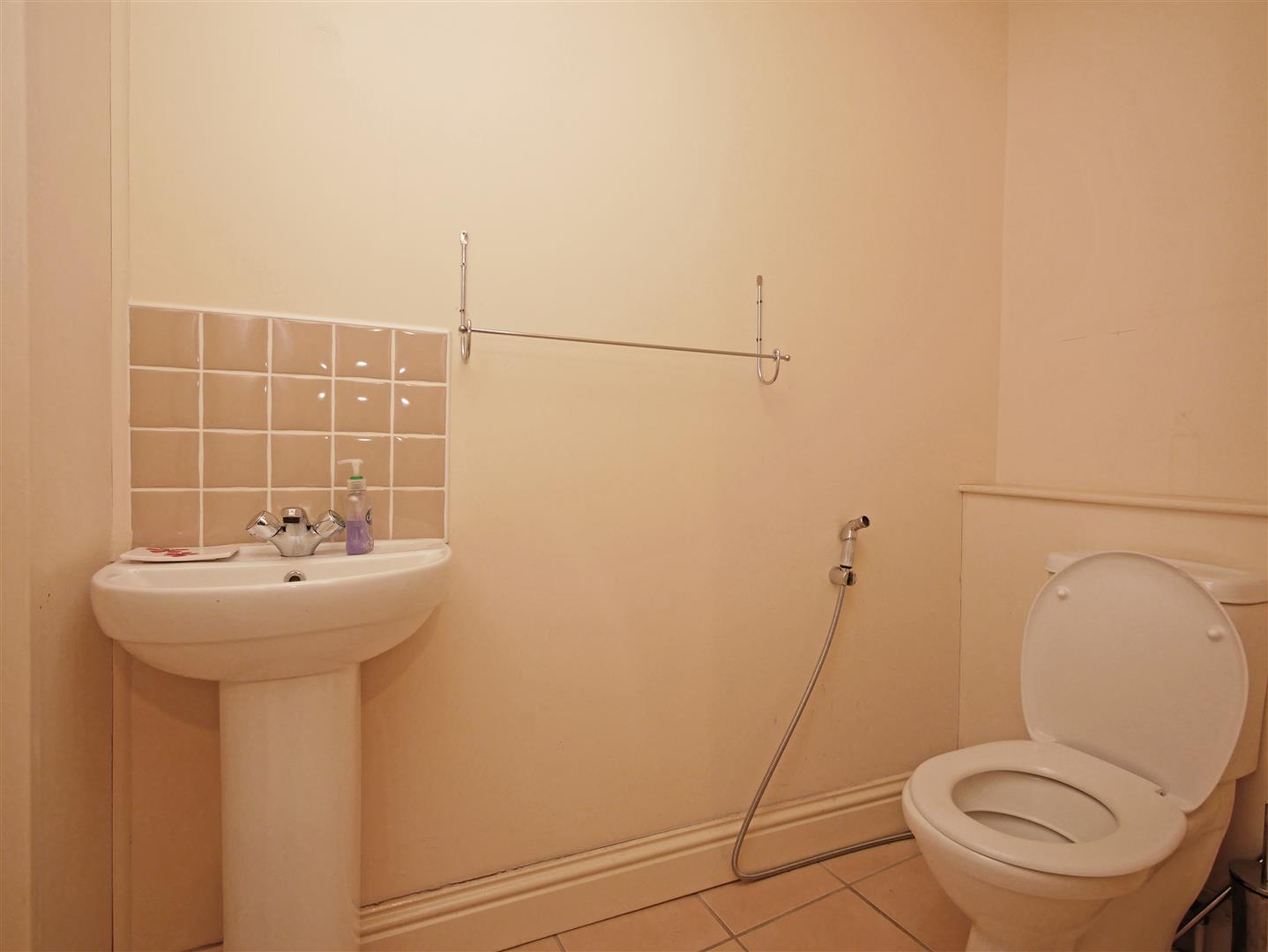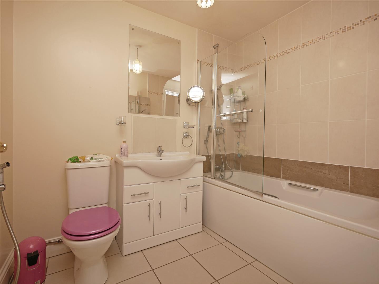 Fitted ensuite complete with corner shower cubicle, pedestal wash hand basin and low flush w.c. Tiled walls and flooring.