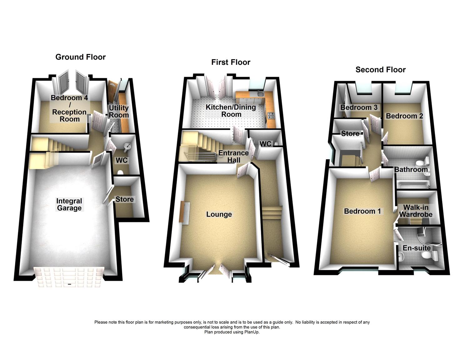 Internally the property is in excellent condition and offers a versatile layout which comprises of a first floor entrance hall with w/c, open plan kitchen / dining room and spacious first floor lounge. On the top floor there is three good sized bedrooms with master ensuite and walk-in wardrobe and fitted white bathroom suite. On the ground floor there is a fourth bedroom / reception room, utility room, w.c and integral garage.