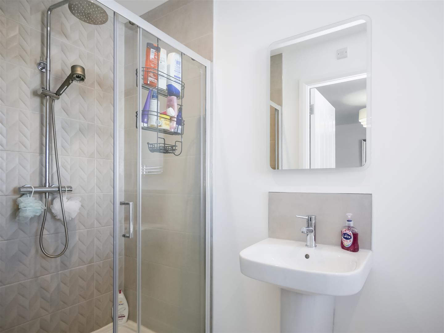 Comprising large walk in shower unit with chrome shower unit with drench head shower unit, wash hand basic with mixer taps, low flush w.c Tiled flooring. Spot-lights.