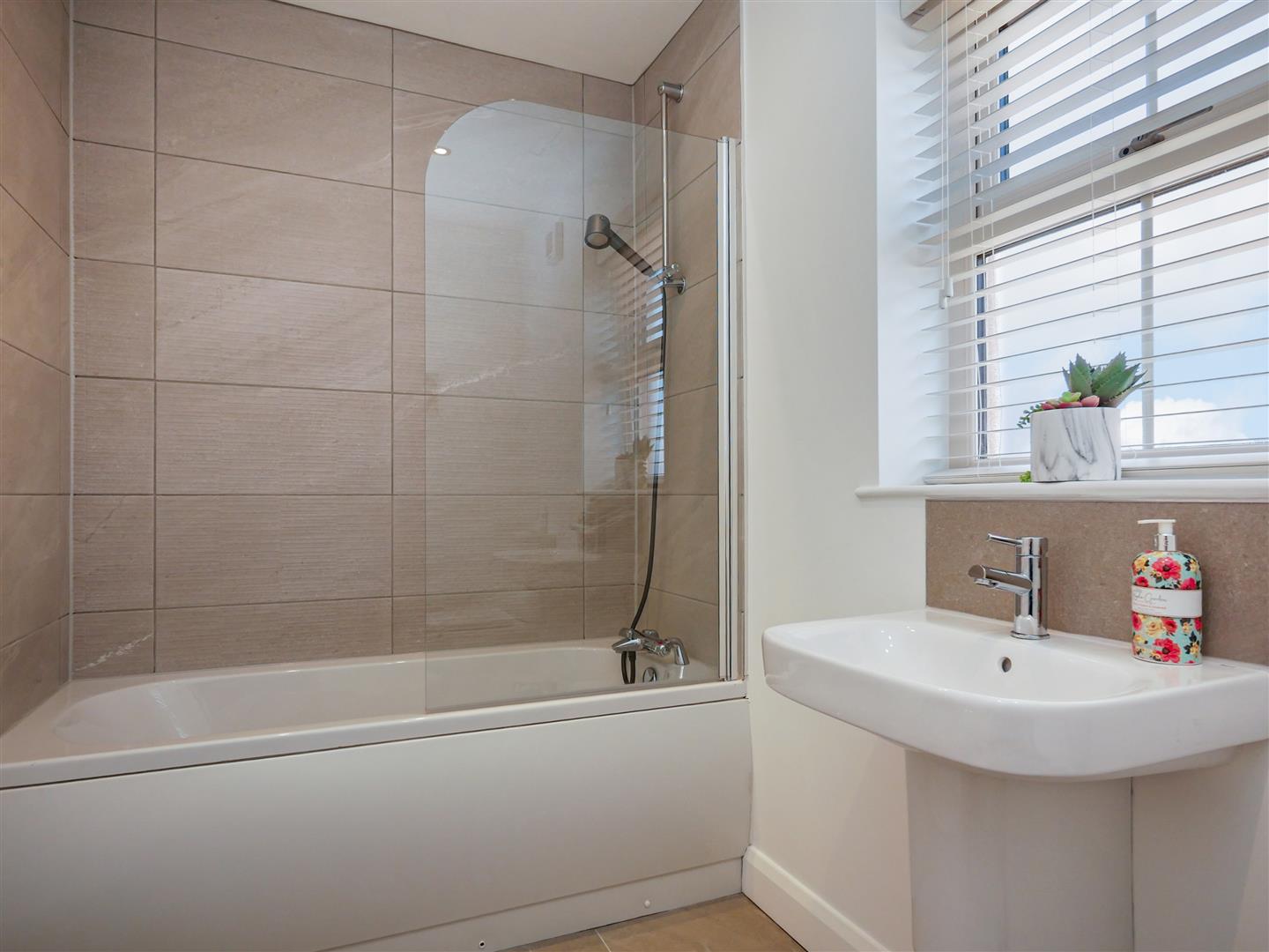 Comprising panelled bath with mixer taps, and hand shower, wash hand basin with mixer taps, low flush w.c Fully tiled walls. Tiled flooring.