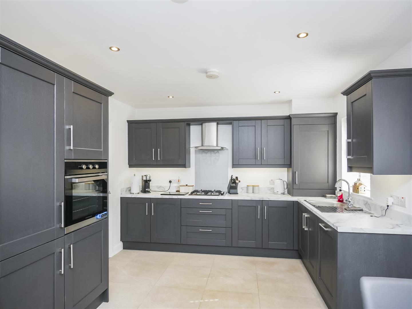 Excellent range of high and low level units, marble effect work tops, built in 4 ring gas hob, overhead stainless steel extractor fan. Integrated fridge freezer and dishwasher, eye level oven. Tiled flooring. Spotlights. Open plan to Sun Room.
