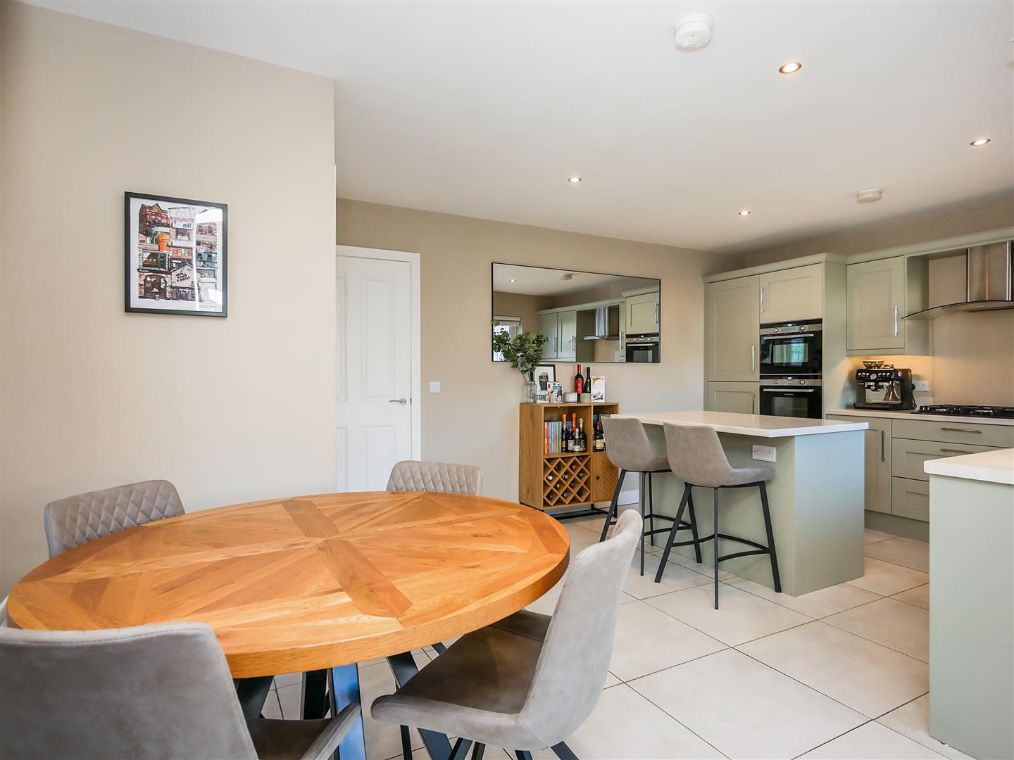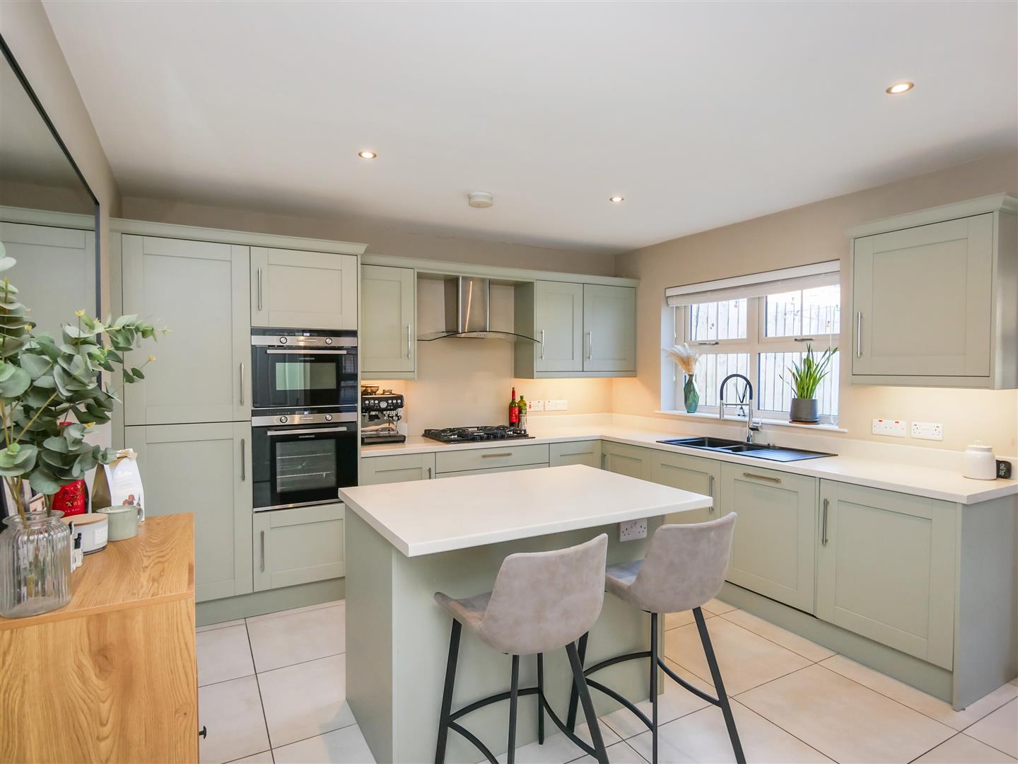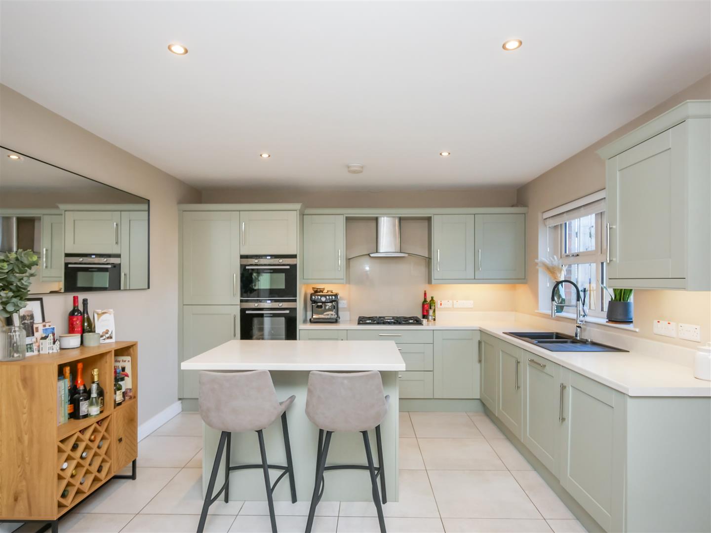 Shaker style hand painted wooden kitchen benefitting from a fantastic range of high and low level units with marble effect work tops, built in 5 ring gas hob with stainless steel overheard extractor fan, granite sink unit, double oven, integrated fridge freezer, washing machine and dishwasher, Centre island with, integrated fridge, integrated bin system and breakfast bar. Tiled flooring. Spot-lights.
