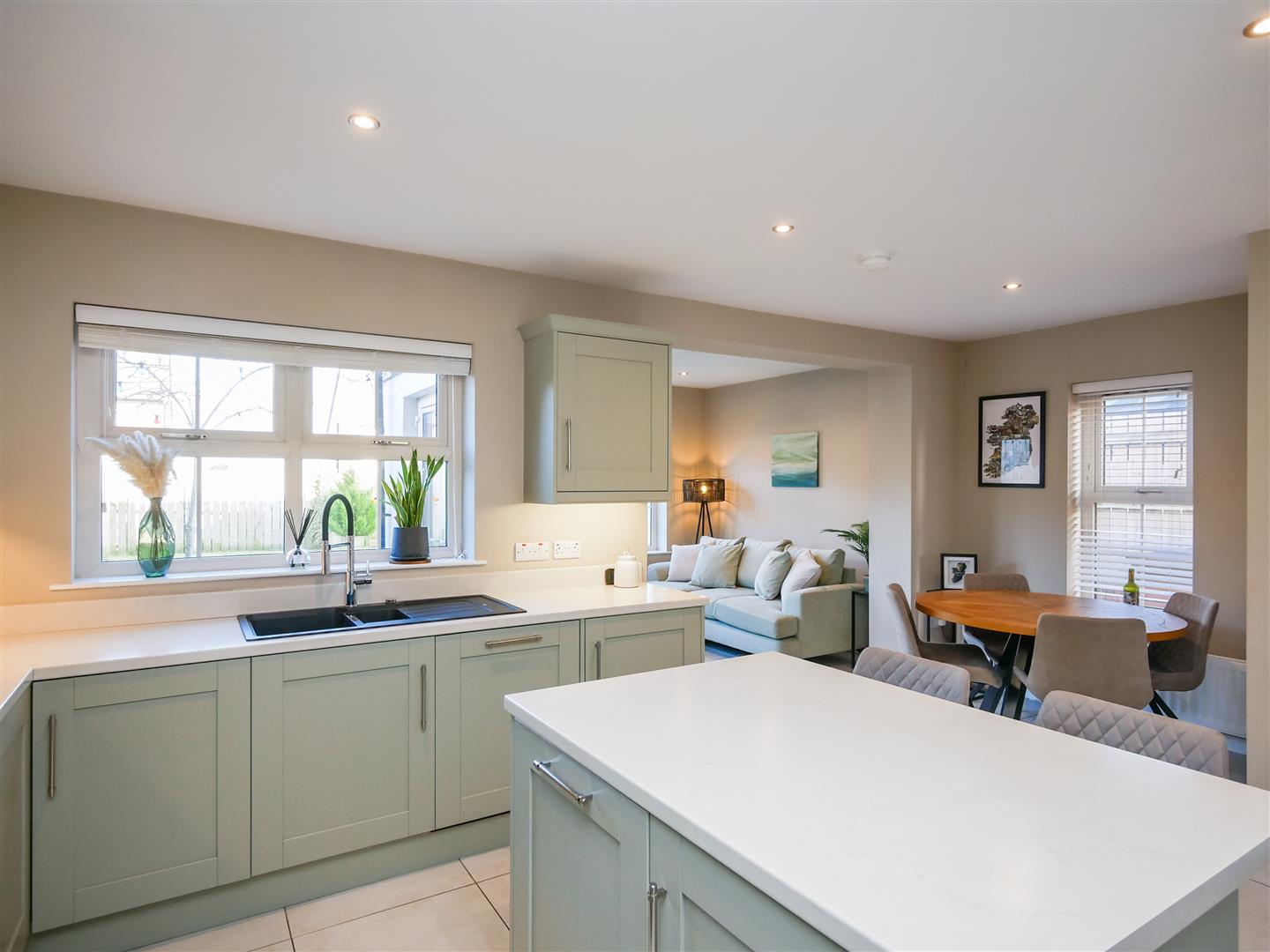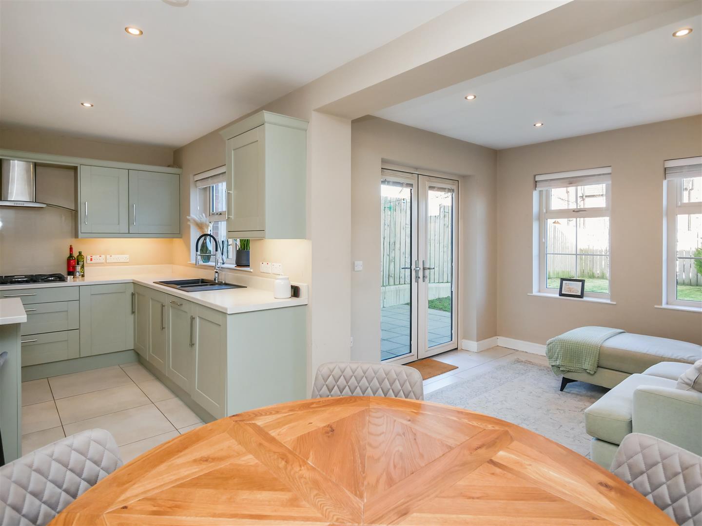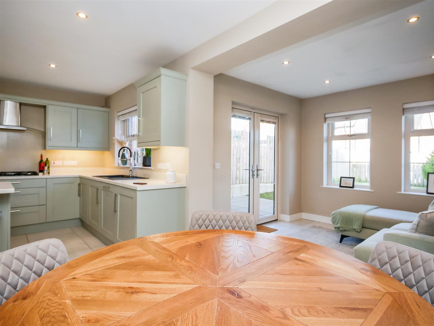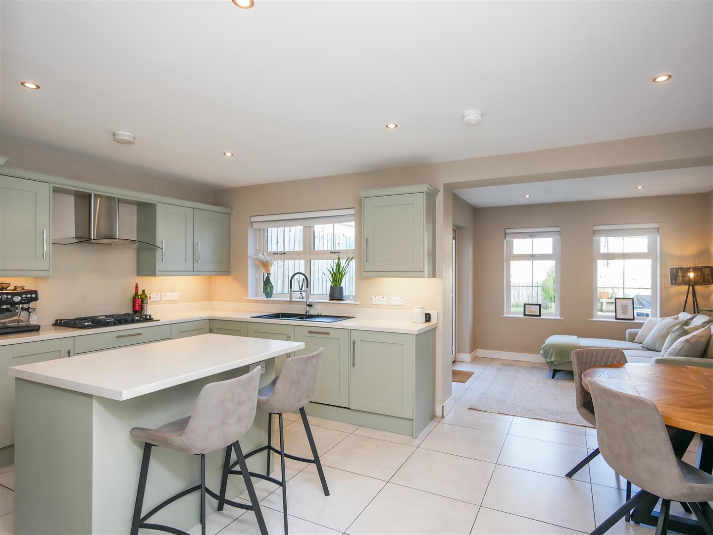 Shaker style hand painted wooden kitchen benefitting from a fantastic range of high and low level units with marble effect work tops, built in 5 ring gas hob with stainless steel overheard extractor fan, granite sink unit, double oven, integrated fridge freezer, washing machine and dishwasher, Centre island with, integrated fridge, integrated bin system and breakfast bar. Tiled flooring. Spot-lights.