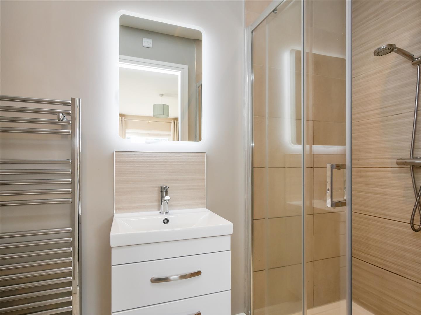 Comprising walk in shower cubicle with chrome shower unit with Drench head shower attachment, wash hand basin with mixer taps and storage below, illumined vanity mirror above, low flush w.c heated chrome towel rail. Part tiled walls. Tiled flooring. Spot-lights.