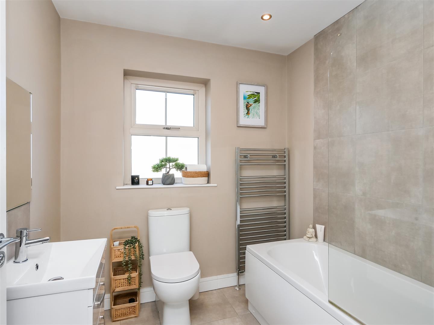 Comprising panelled bath with mixer taps hand shower, wash hand basin with mixer taps and storage below, mirror above, low flush w.c Part tiled walls. Tiled flooring. Heated chrome towel rail.