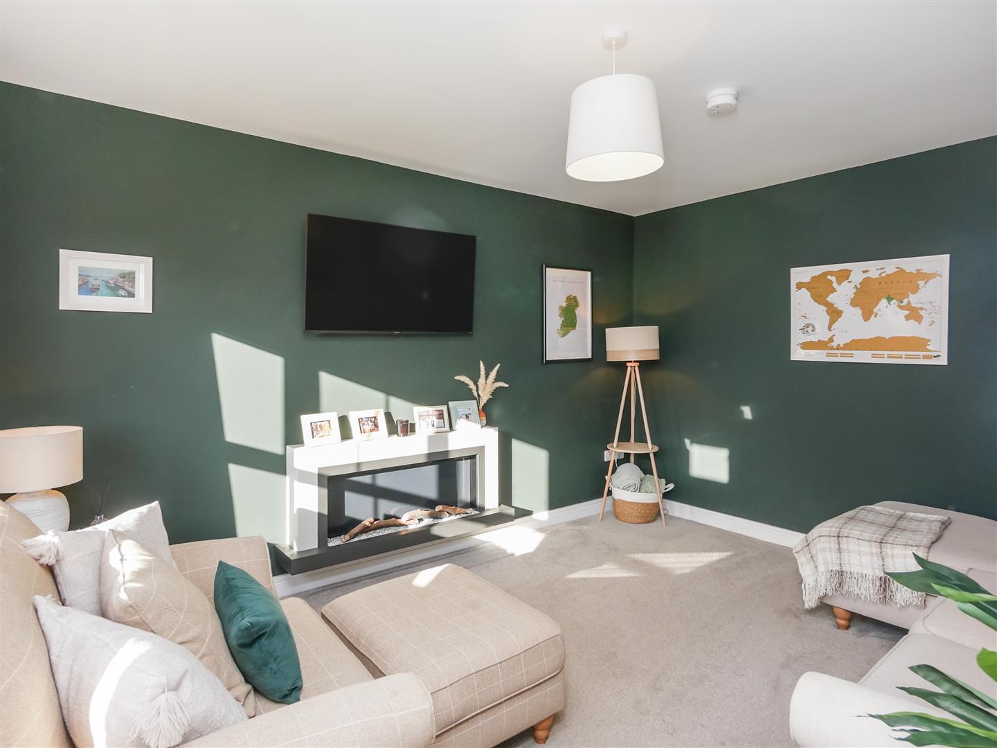 Contemporary wall mounted fireplace with electric fire.