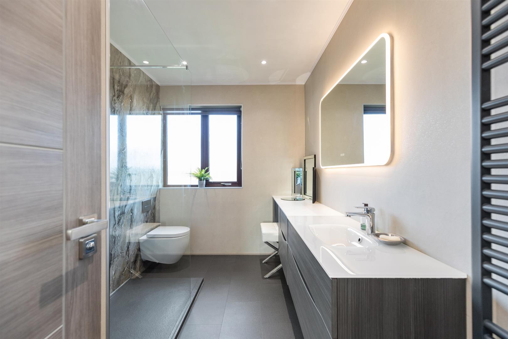 Luxury en-suite comprising walk in shower cubicle with chrome thermostatically controlled shower fittings, low flush w/c, wash hand basin with storage below, extractor fan, recessed spotlights, wall-mounted radiator.