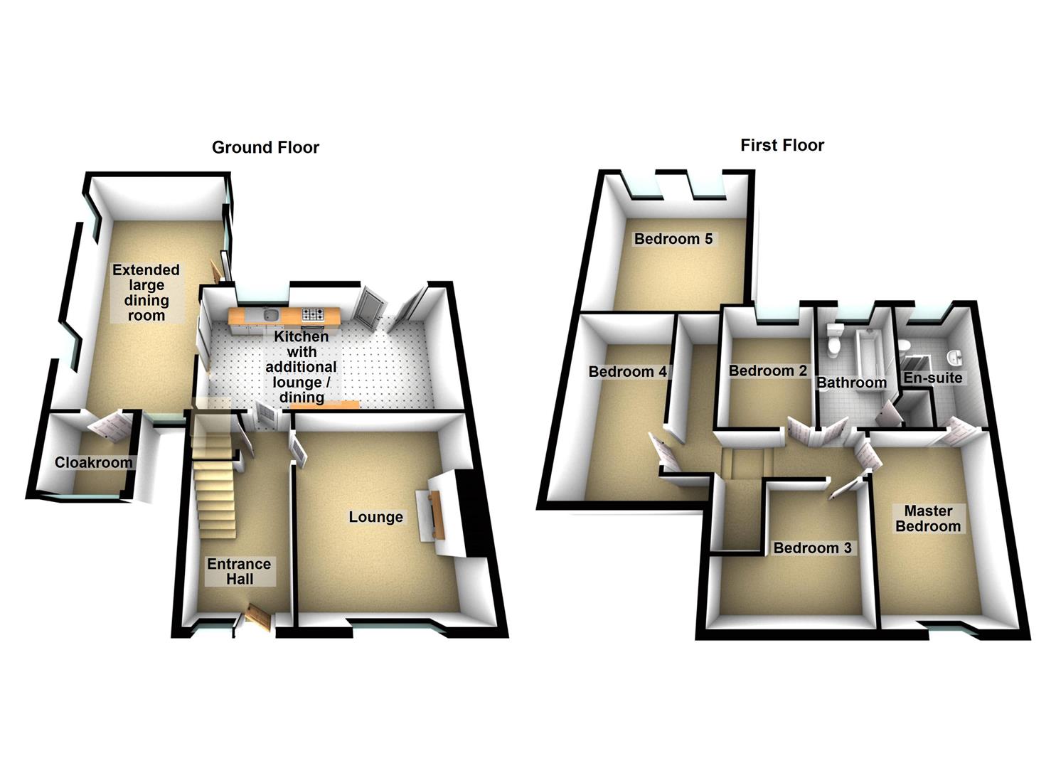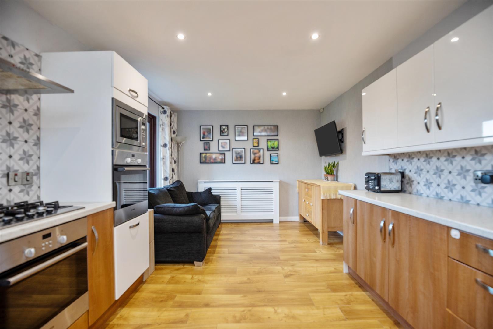 Full range of high and low level units, single drainer sink unit with mixer taps, 5 ring gas hob and 2 ovens, Integrated microwave, integrated dishwasher, plumbed for washing machine, laminate flooring, recessed spotlights, open to the casual dining area, double doors to the rear garden.