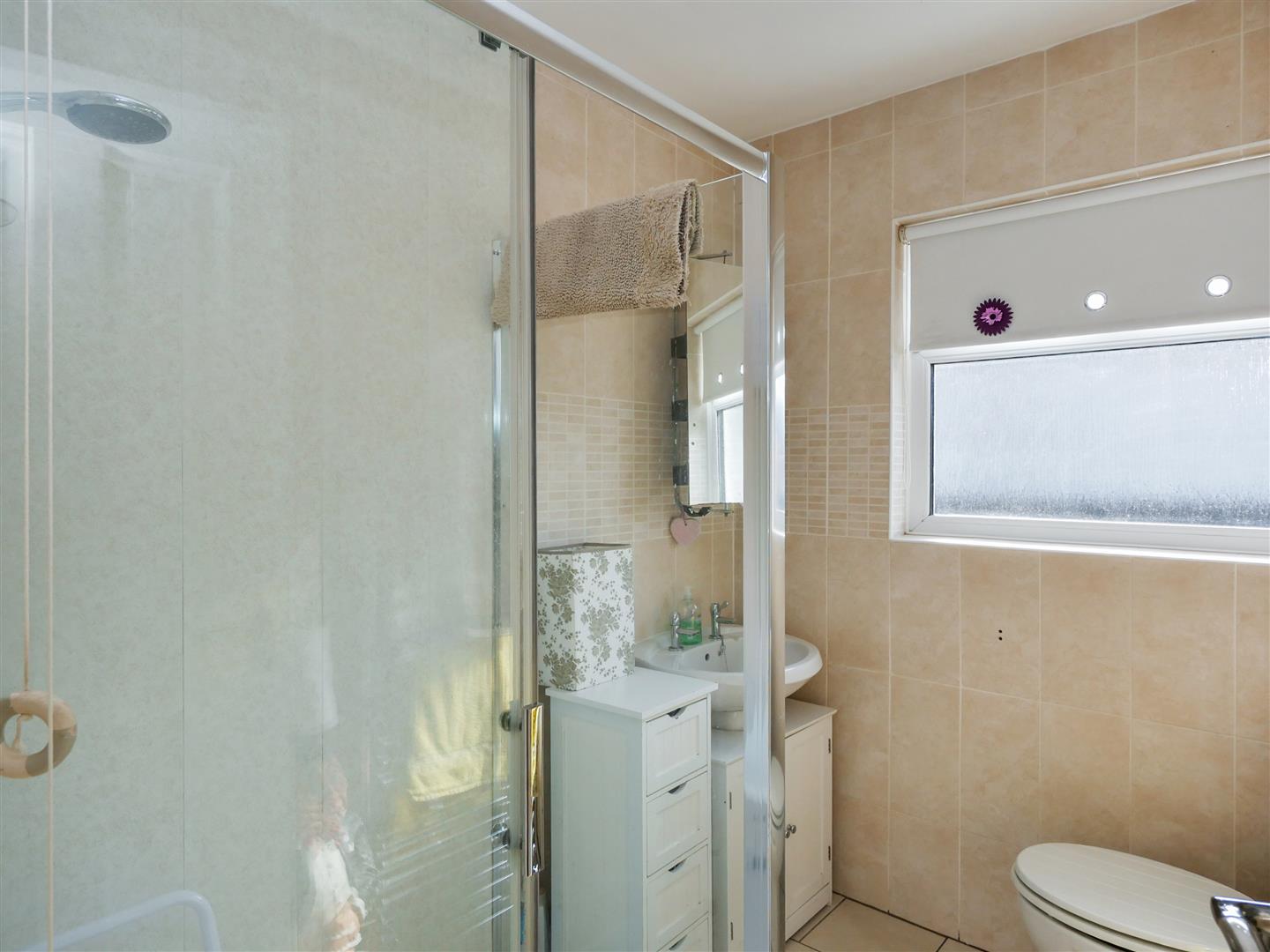 Comprising walk in shower cubicle with Triton shower unit, pedestal wash hand basin, low flush w,c Part tiled walls. Tiled flooring. Access to the roof space. Heated chrome towel rail.