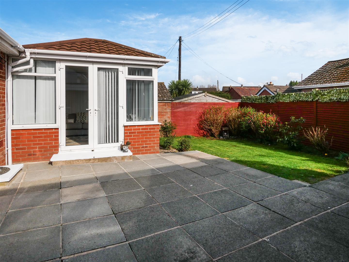 Enclosed patio area, garden laid lawn, bordered by timber fencing.