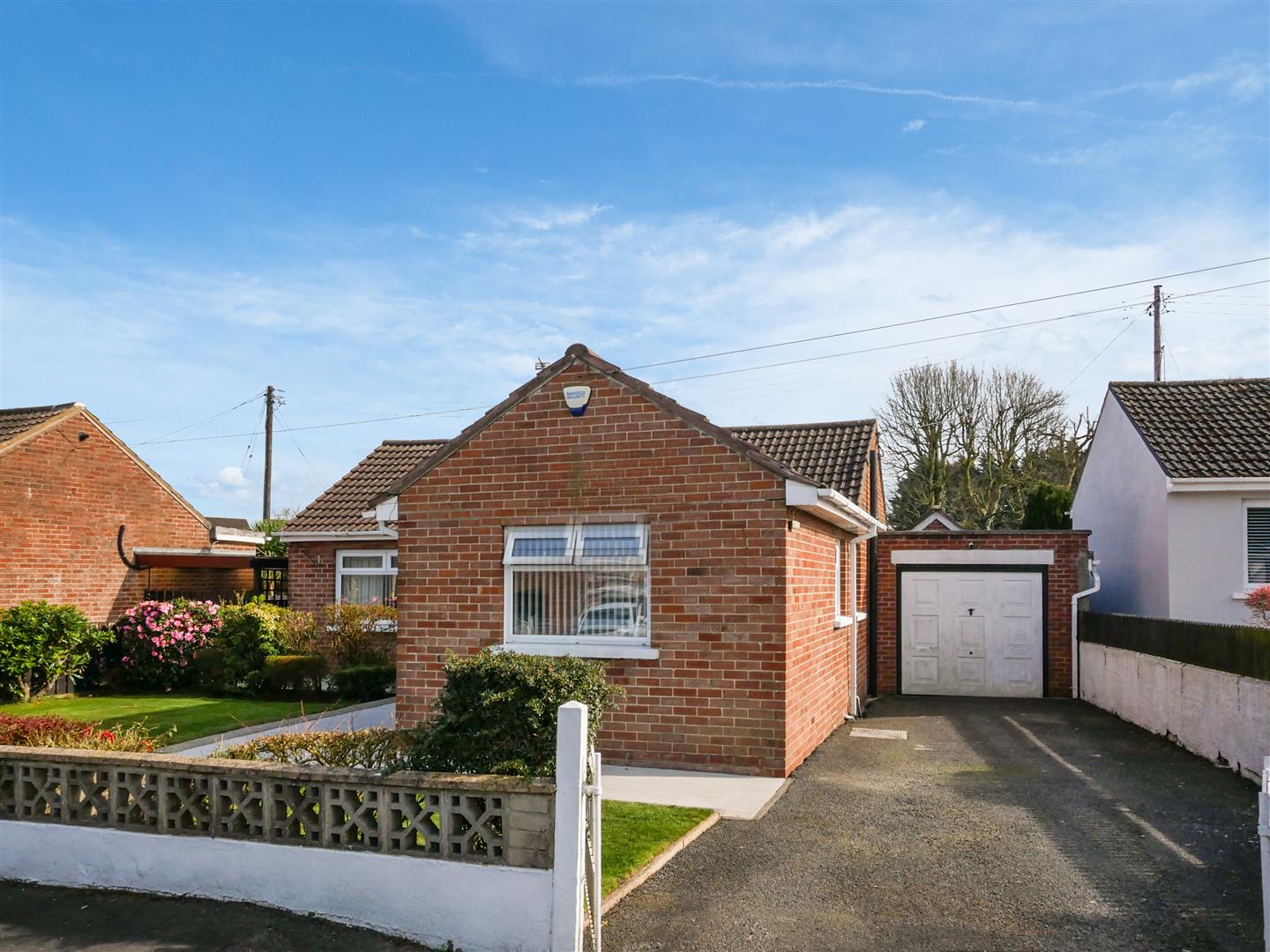 Front garden laid in lawn with excellent range of plants and shrubs. Driveway with parking leading to Detached Garage.