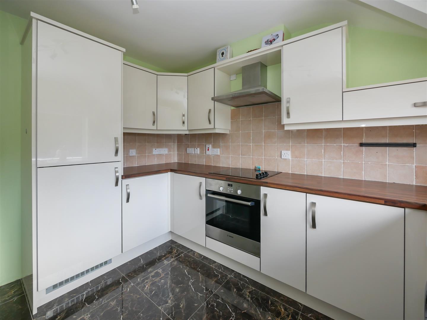 Modern fitted kitchen with a range of high and low level units, single drainer 1 1/4 bowl sink unit with mixer taps, formica work surfaces, part tiled walls, 4 ring hob and under oven, extractor fan, washing machine, tumble dryer, integrated fridge / freezer, tiled floor.