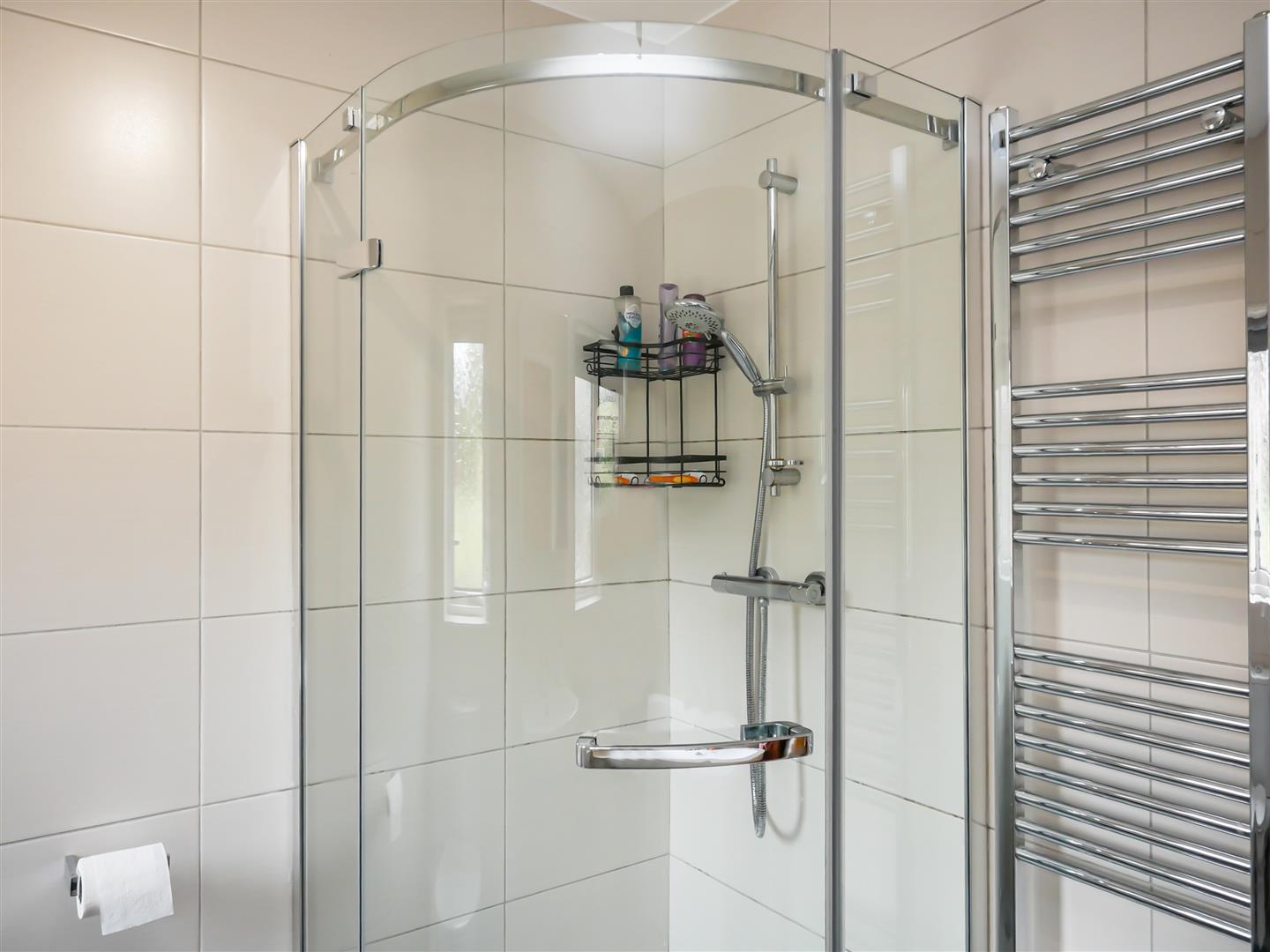 Comprising free standing oval bath with mixer taps, wash hand basin with mixer taps, low flush w.c Separate corner shower cubicle with chrome shower unit. Heated chrome towel rail. Fully tiled walls. Tiled flooring,