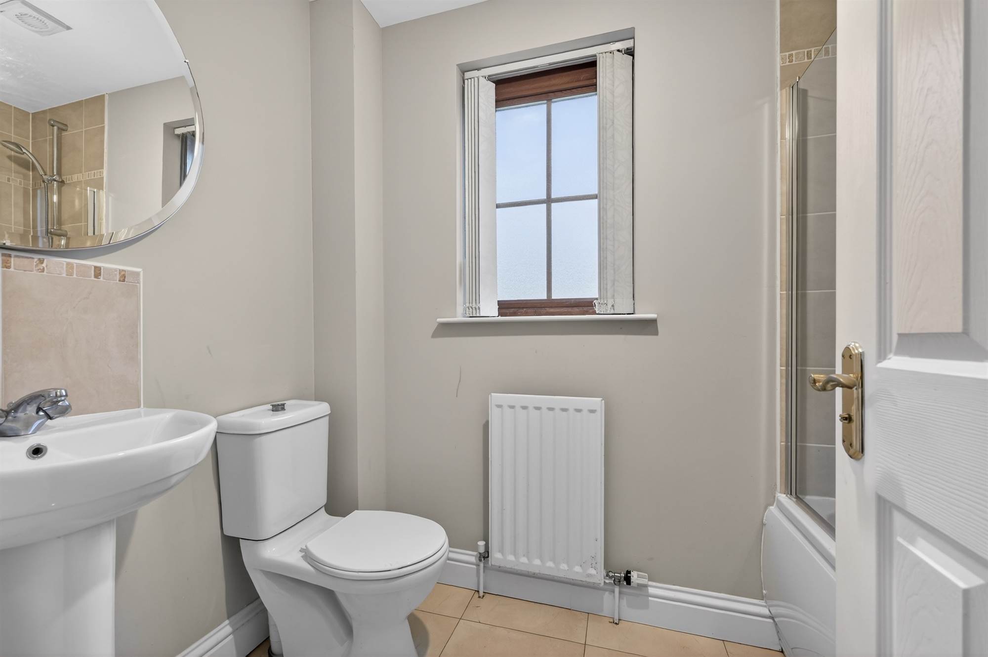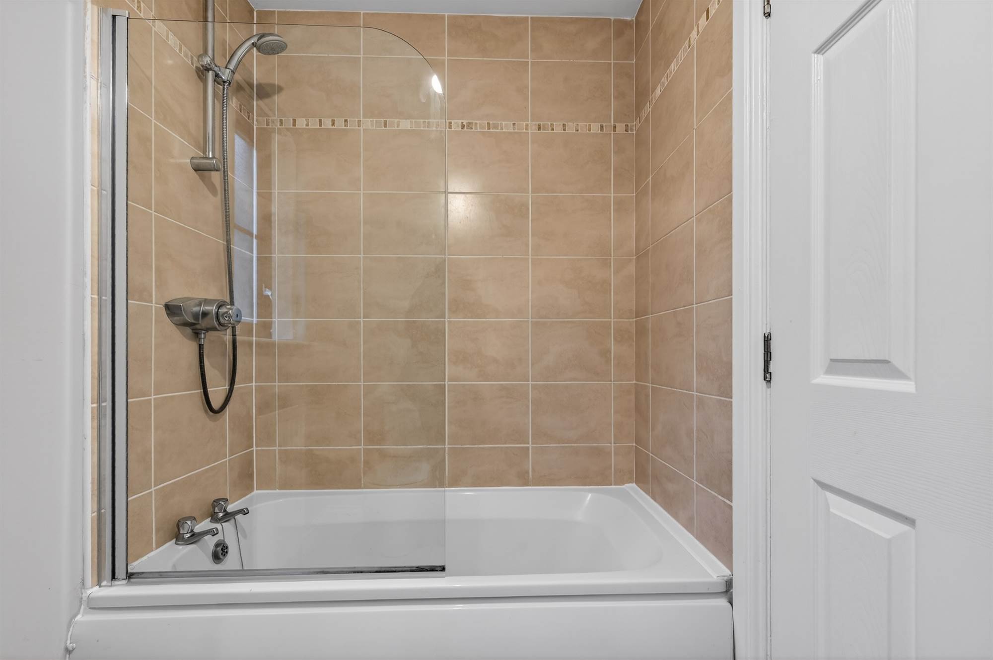 White suite comprising low flush wc, pedestal wash hand basin with chrome mixer tap and tiled splashback, panelled bath, shower screen, built-in shower unit, tiled splashback, ceramic tiled floor.