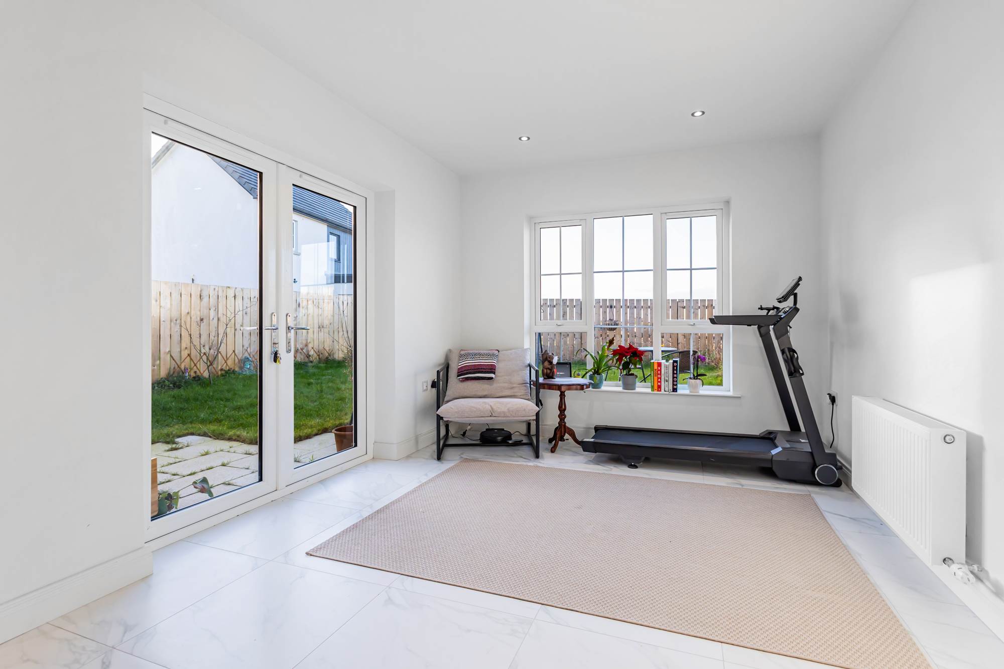 Sunroom with double doors leading to a westerly-facing rear garden