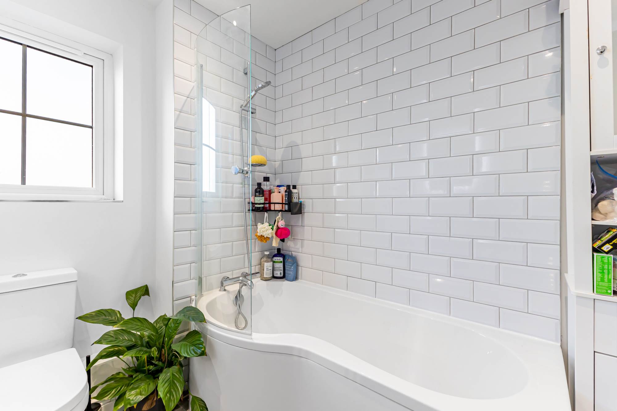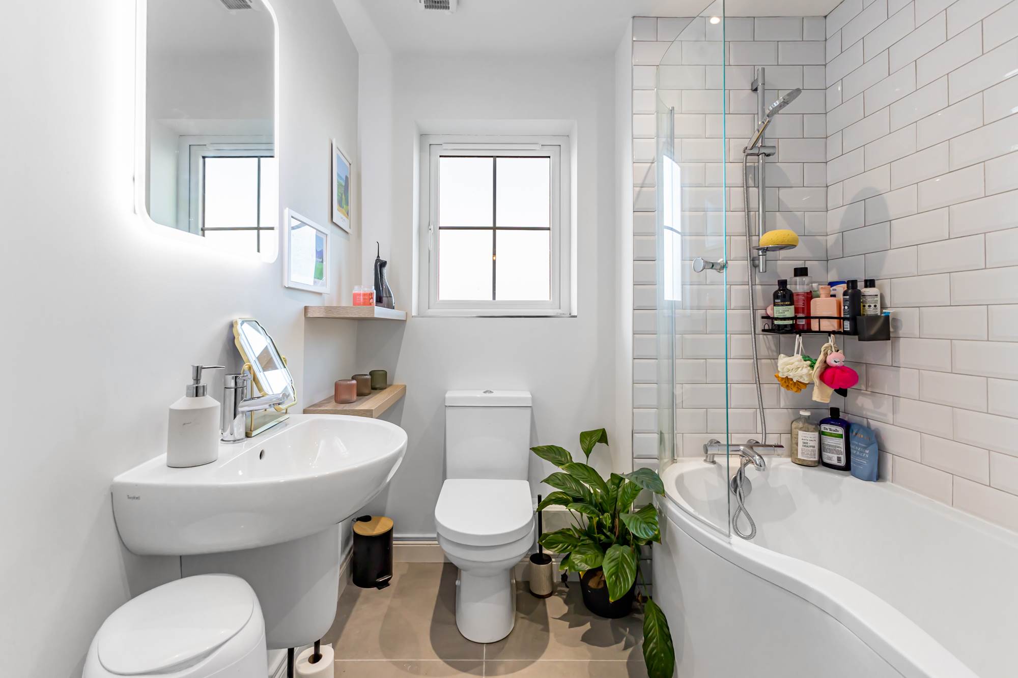 White suite comprising, low flush WC, floating wash hand basin, chrome mixer taps, Panelled bath, shower screen, built-in shower unit, tiled splashback, chrome heated tall rail, ceramic tiled floor, extractor fan.