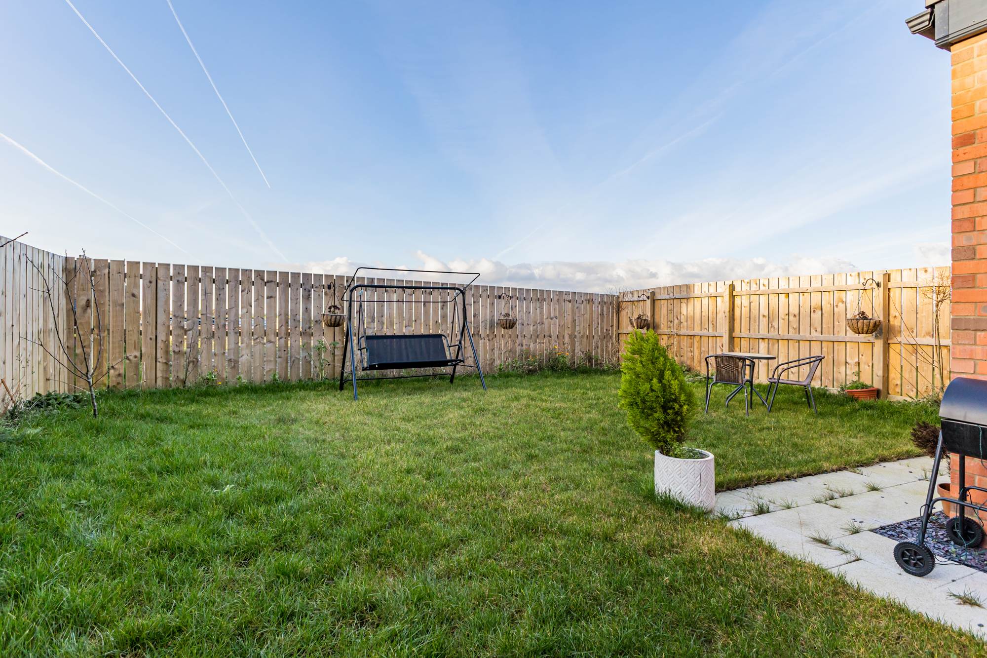 Enclosed Westerly facing rear garden, laid in lawns with paved patio area, ideal for barbeque and outdoor entertaining. garden shed, PVC facia and soffit boards. Tarmac driveway for off street parking, water tap to side. EV electric vehicle charging point.
