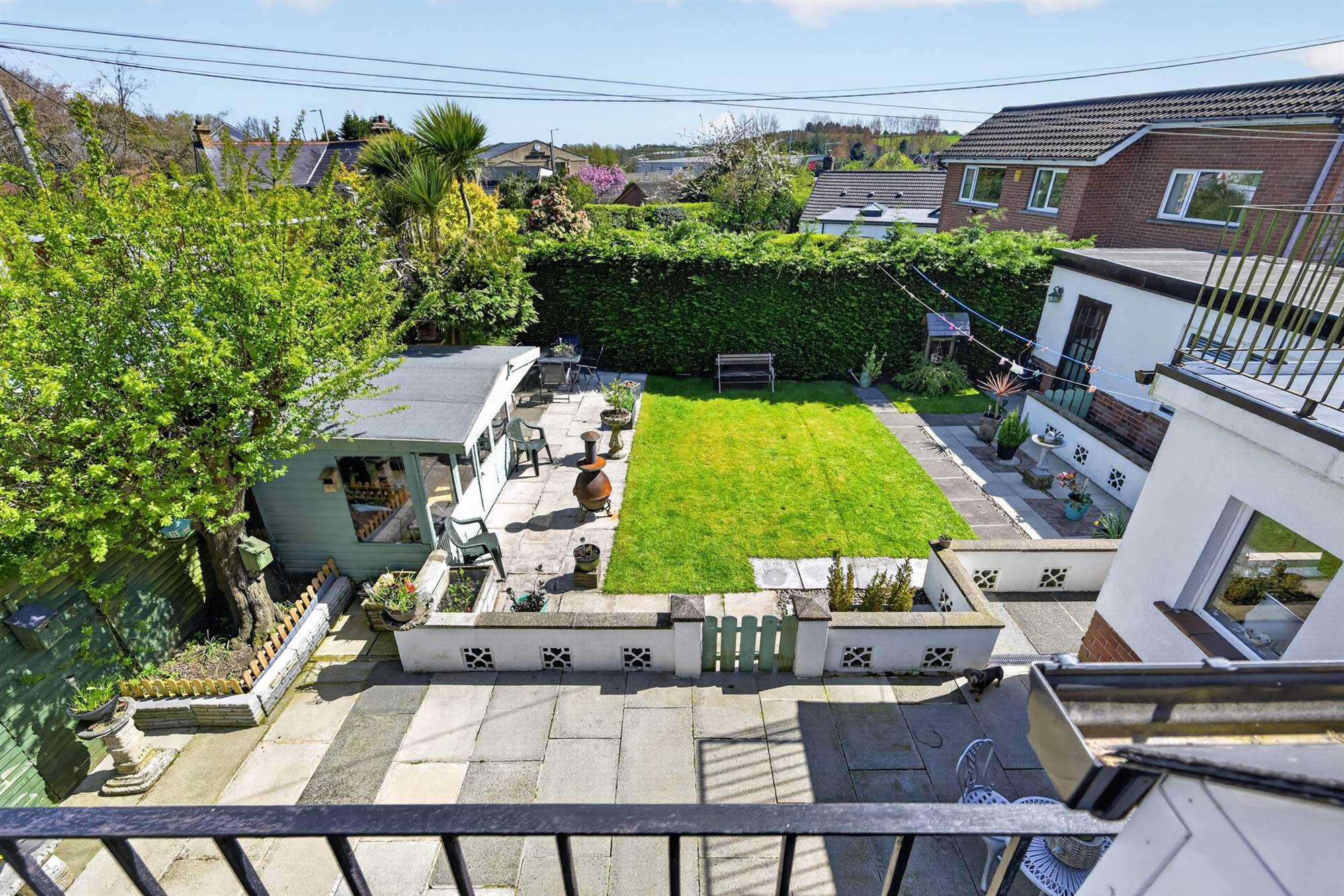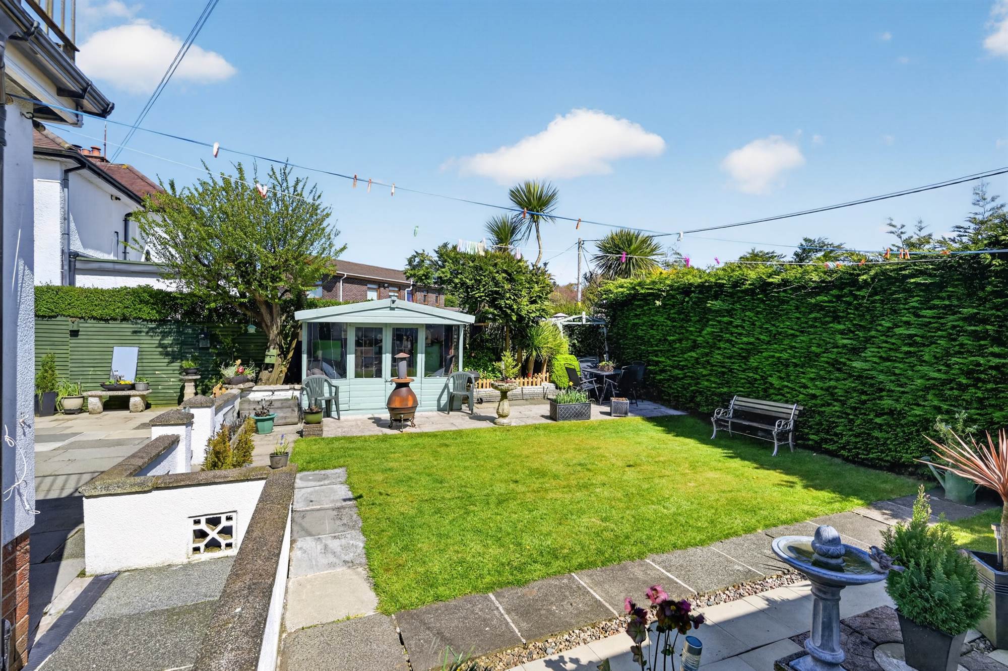 Enclosed rear gardens in lawns with landscaped paving, beds, shrubs, bushes, summer house and paved patios.