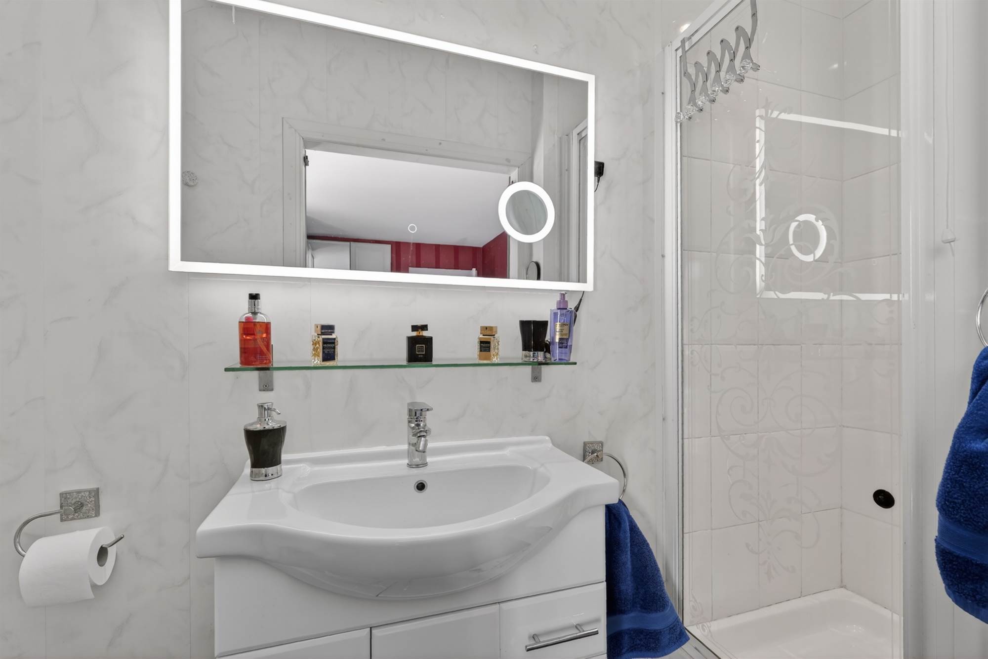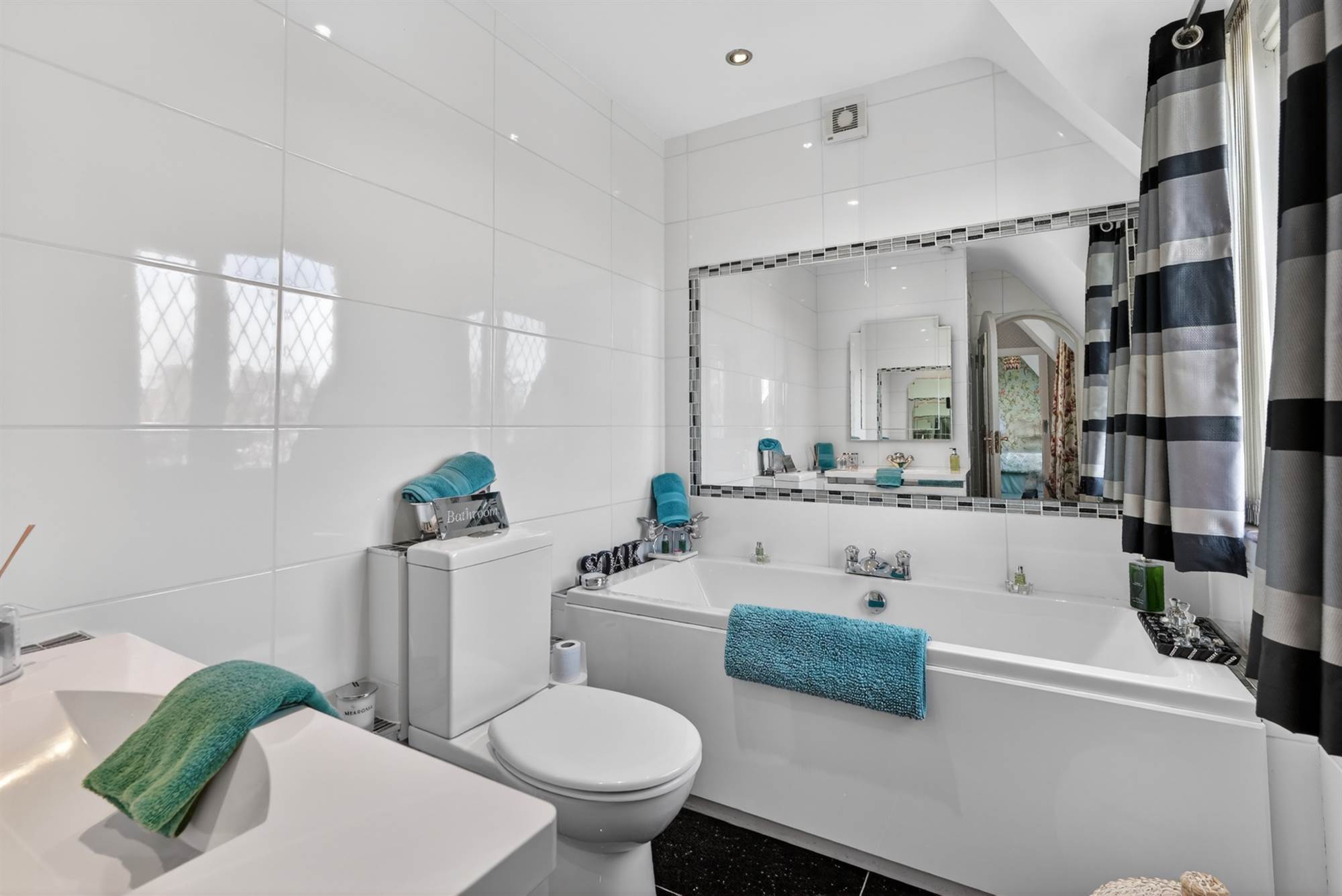 White suite comprising low flush WC, vanity wash hand basin, panelled bath with jacuzzi jets, low voltage spotlighting, tiled floor, fully tiled walls, heated towel rail.