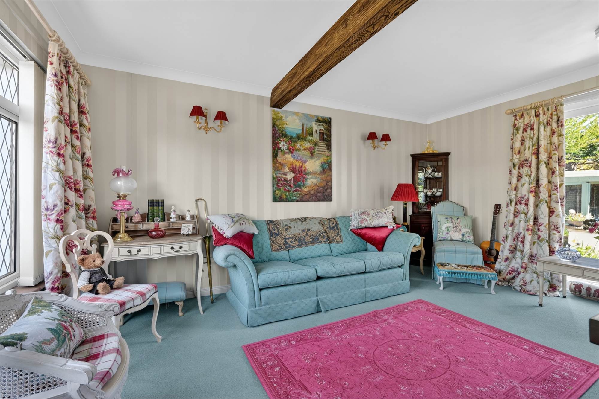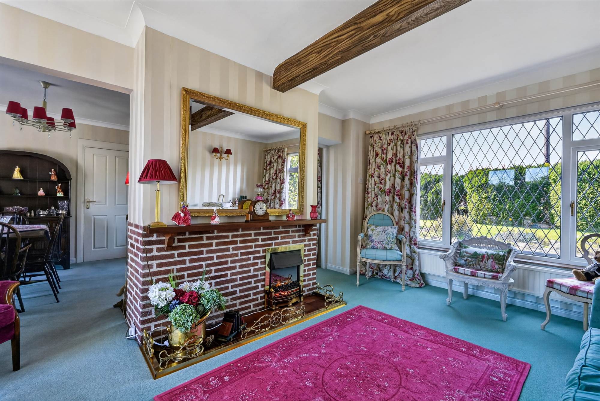 Brick fireplace with tiled hearth, wooden ceiling beam, glazed doors to rear.