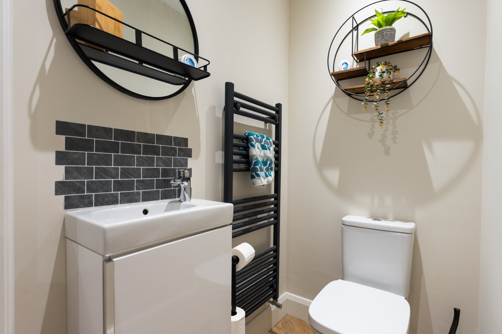 Ceramic tiled floor, low flush WC, pedestal wash hand basin with vanity unit, extractor fan