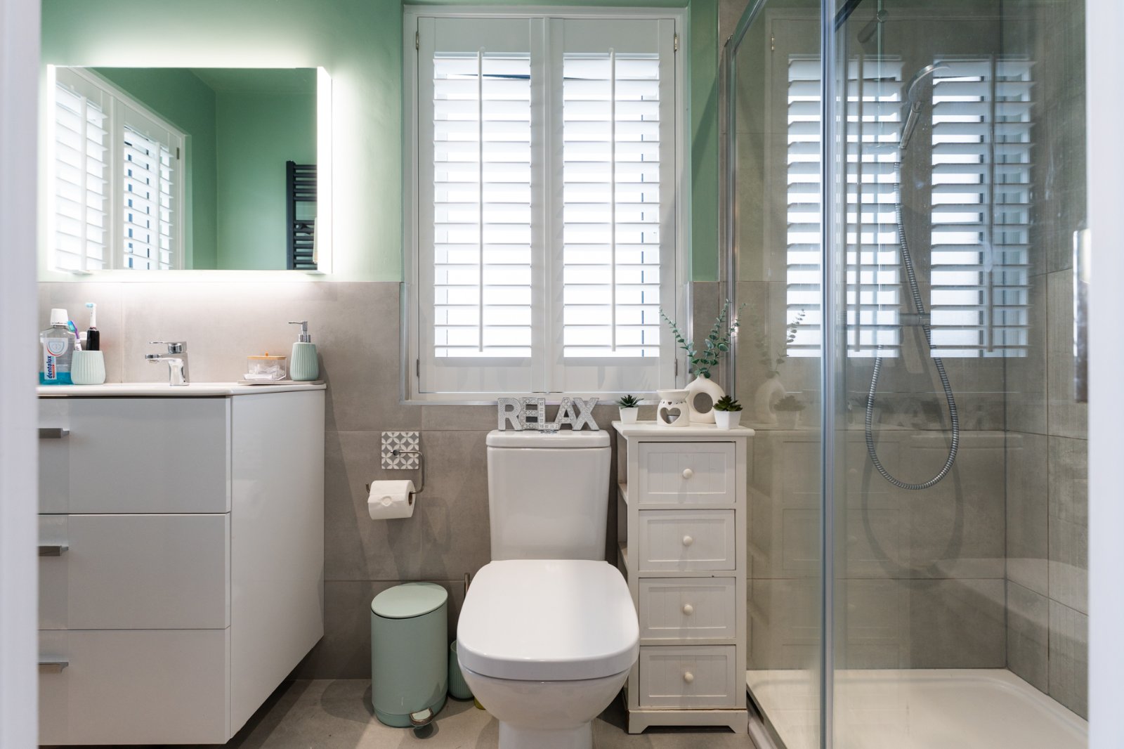 Tiled floor, half tiled walls, low flush WC, pedestal wash hand basin with vanity unit, fully tiled shower cubicle with rainhead shower, extractor fan, spotlighting