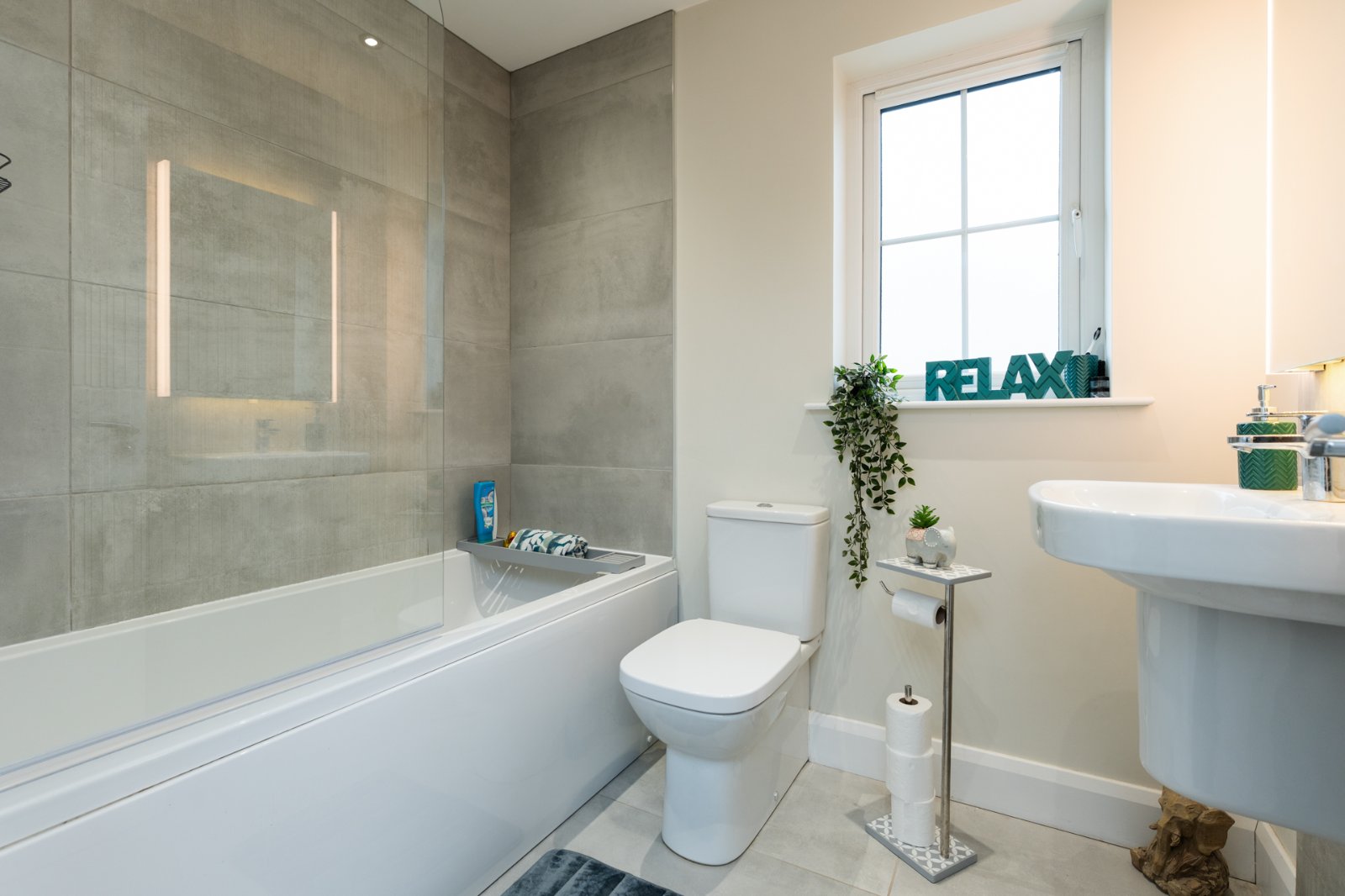 Tiled floor, low flush WC, pedestal wash hand basin, bath with tiled surround and shower above, spotlights, extractor fan