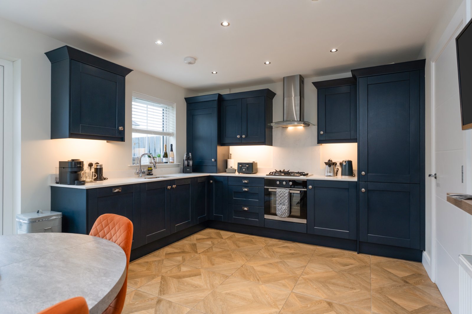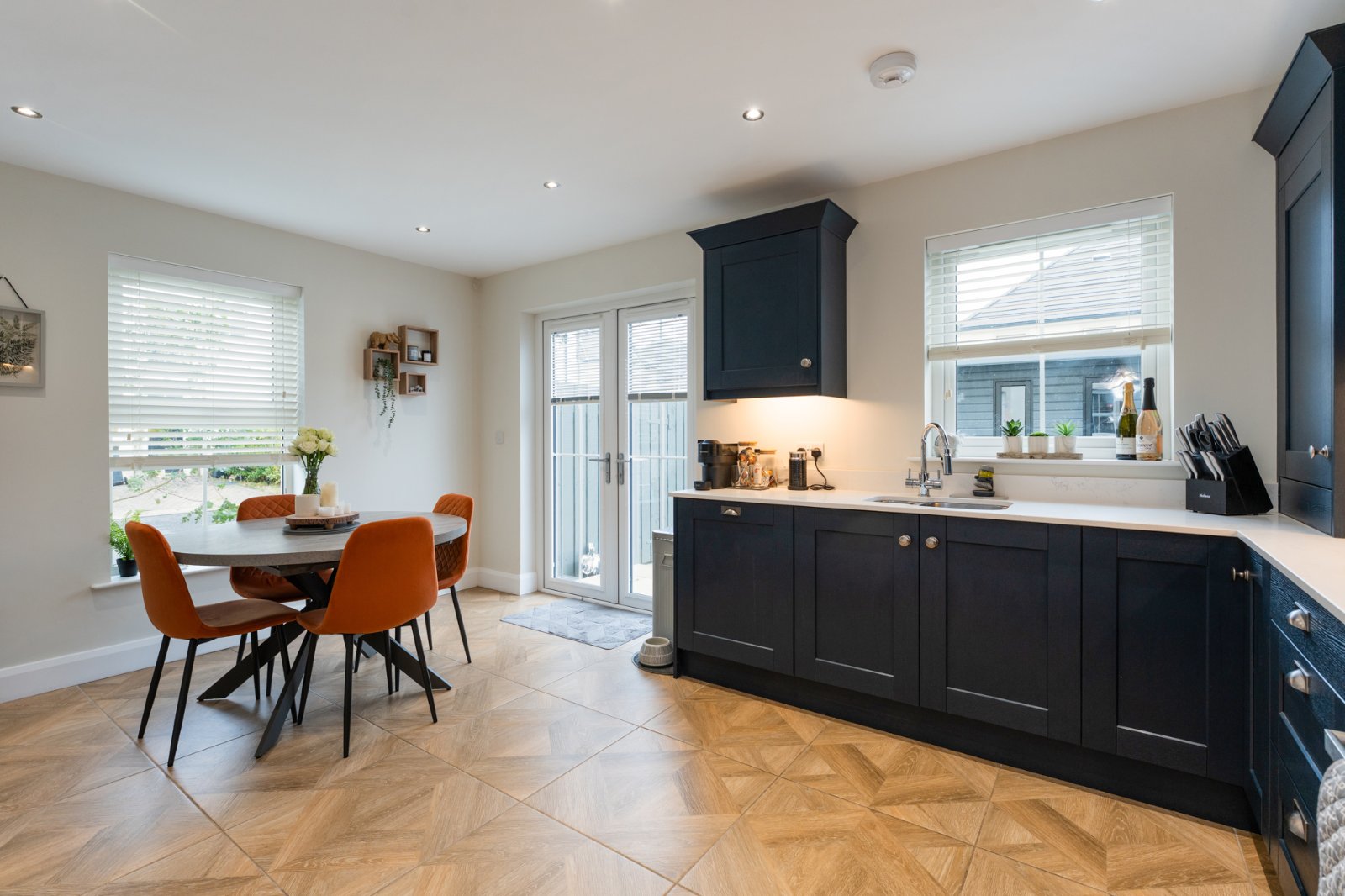 Tiled floor, spotlighting, range of high and low level units, quartz worktops, inset 1.5 bowl stainless steel sink unit, integrated fridge frezer, 4 ring ceramic hob, granite splash back, Worchester gas boiler, double uPVC doors to outside