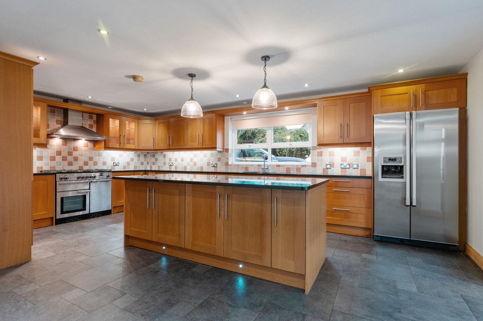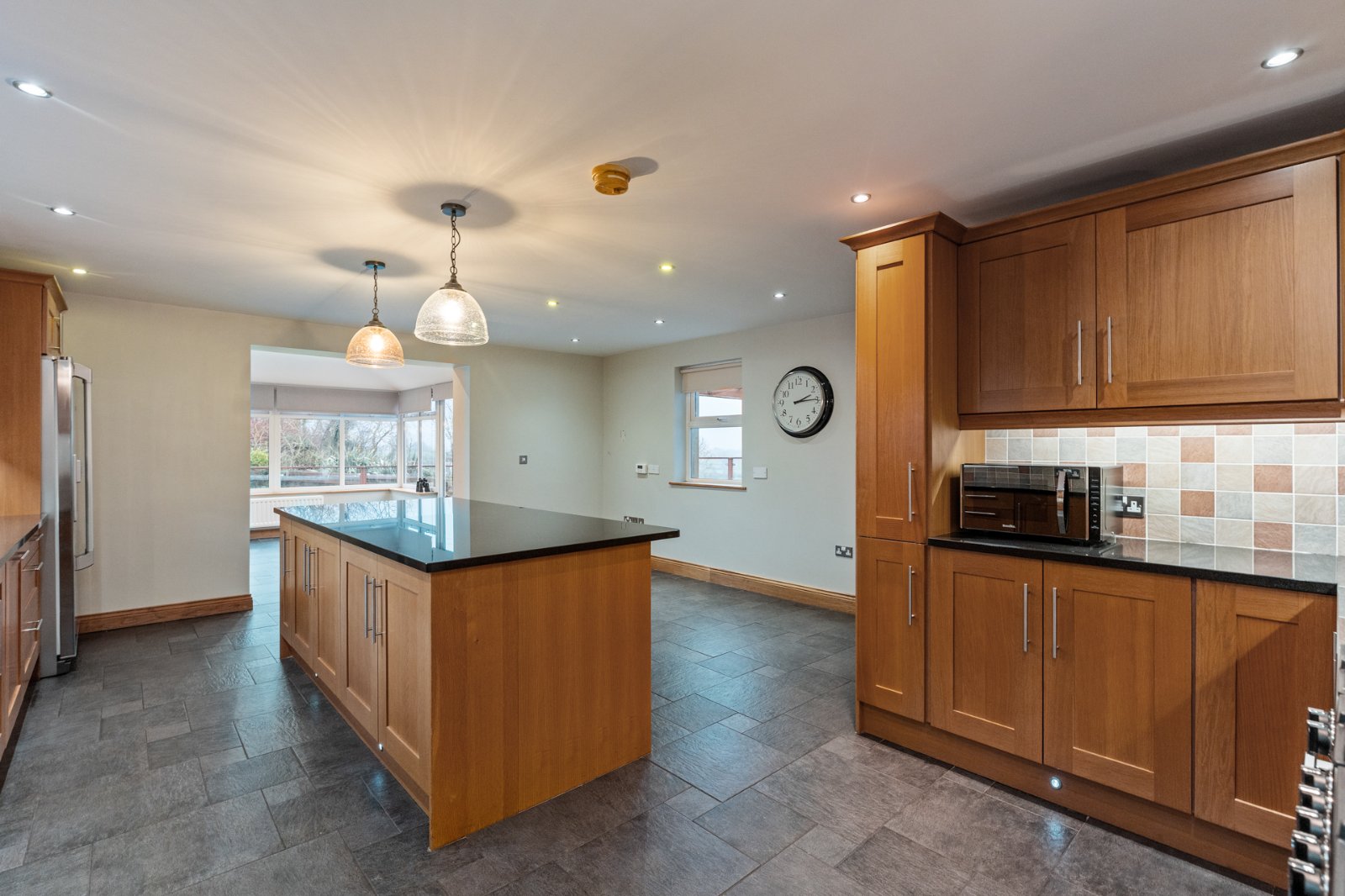Modern fitted kitchen with excellent range of units, granite work tops, matching island and integrated appliances. Open to