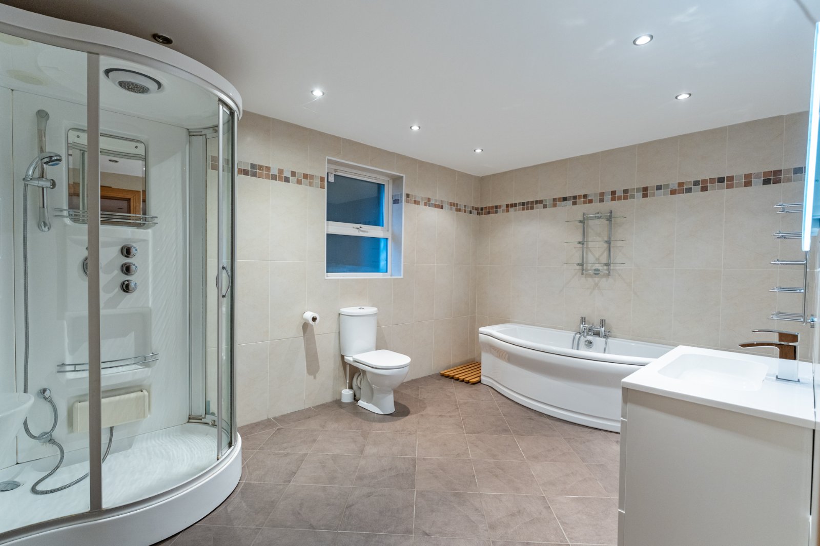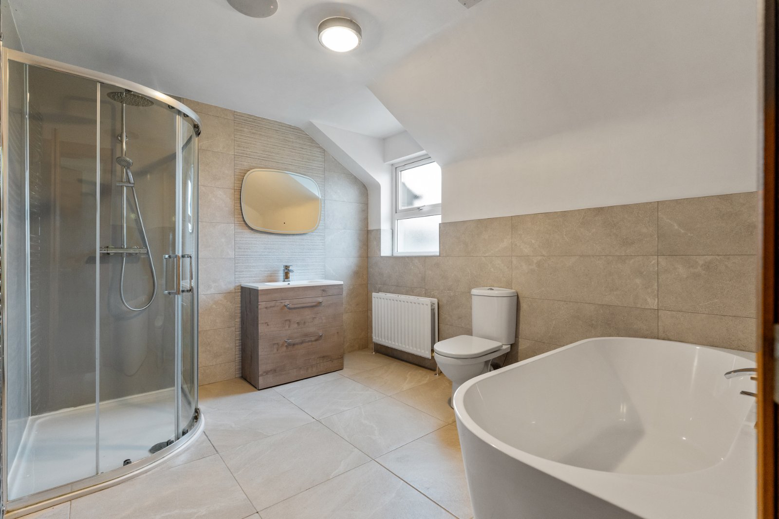 Luxury suite comprising paneled bath, WC, vanity unit, corner shower cubicle, heated towel rail