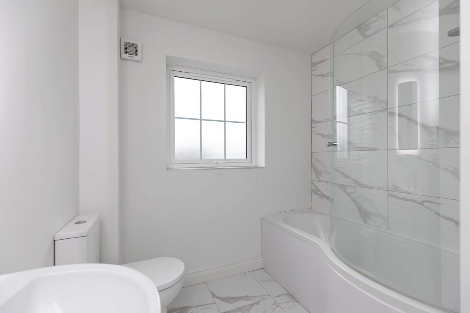 Contemporary white suite with feature tiling and airing cupboard